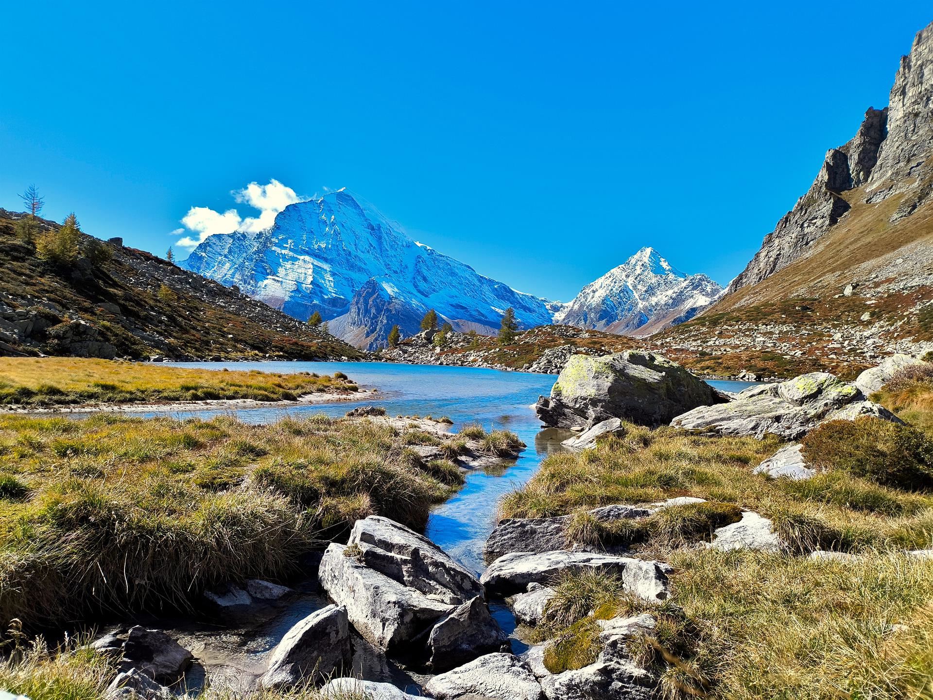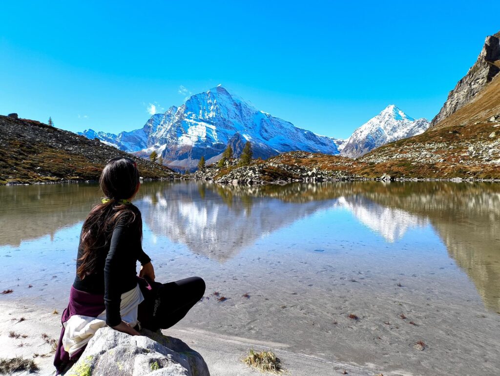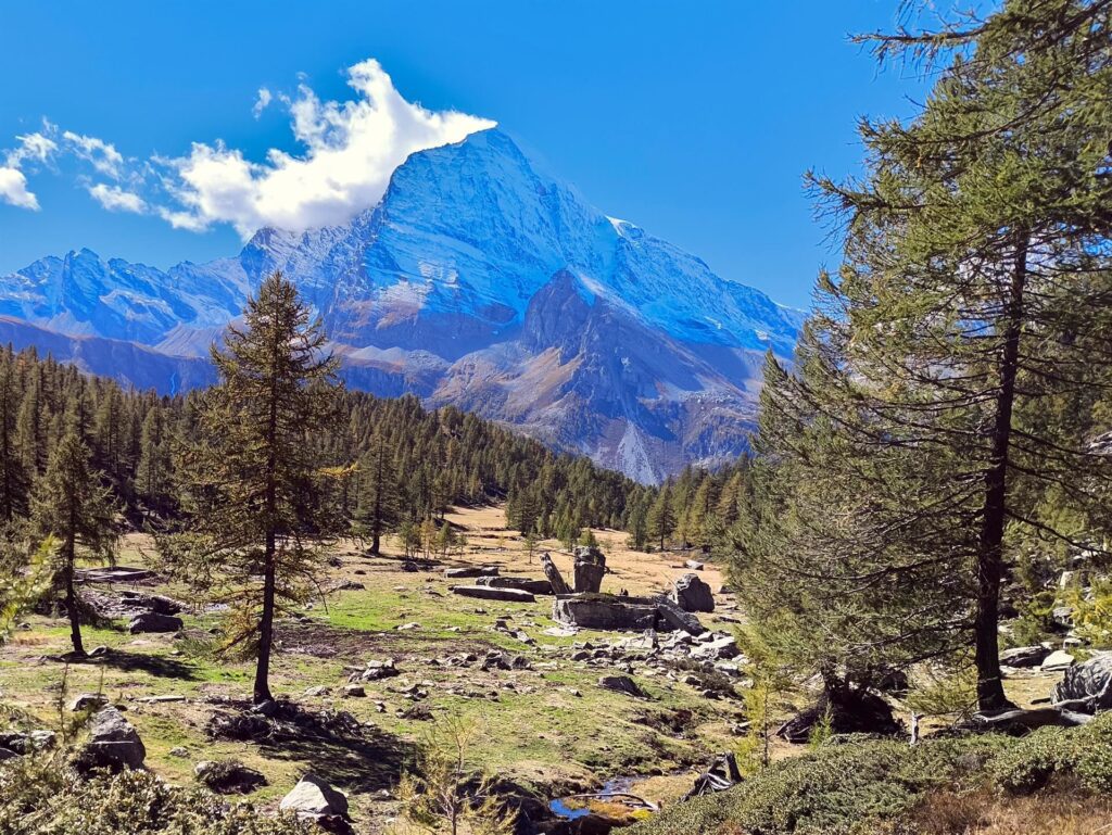 L’Alpe Veglia è per noi un posto del cuore, meno inflazionata della pur bellissima e vicina Alpe Devero grazie alla necessità di dover camminare già solo per raggiungerla. Dai lariceti alle distese di mirtilli più in alto fin quasi alla quota delle pietraie in questo giro ad anello ci si immerge in un territorio incontaminato, dove cantano i ruscelli e l’orizzonte è sorvegliato dalla imponente mole del Monte Leone con i suoi 3.552 metri di altezza.