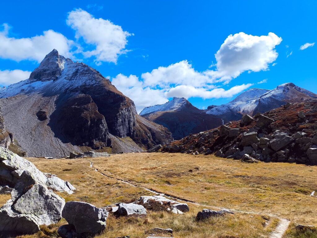 Lo si imbocca con indicazioni per Lago Bianco e Passo di Boccareccio, attraversando all’inizio un bel bosco di larici, che lasciano poi il posto a distese infinite di mirtilli: nel nostro caso per i frutti era un po’ tardi, ma gli arbusti si erano già colorati di un bel rosso acceso che è stato una gioia per gli occhi. Non dimenticate di guardarvi alle spalle… il Monte Leone vi osserva!