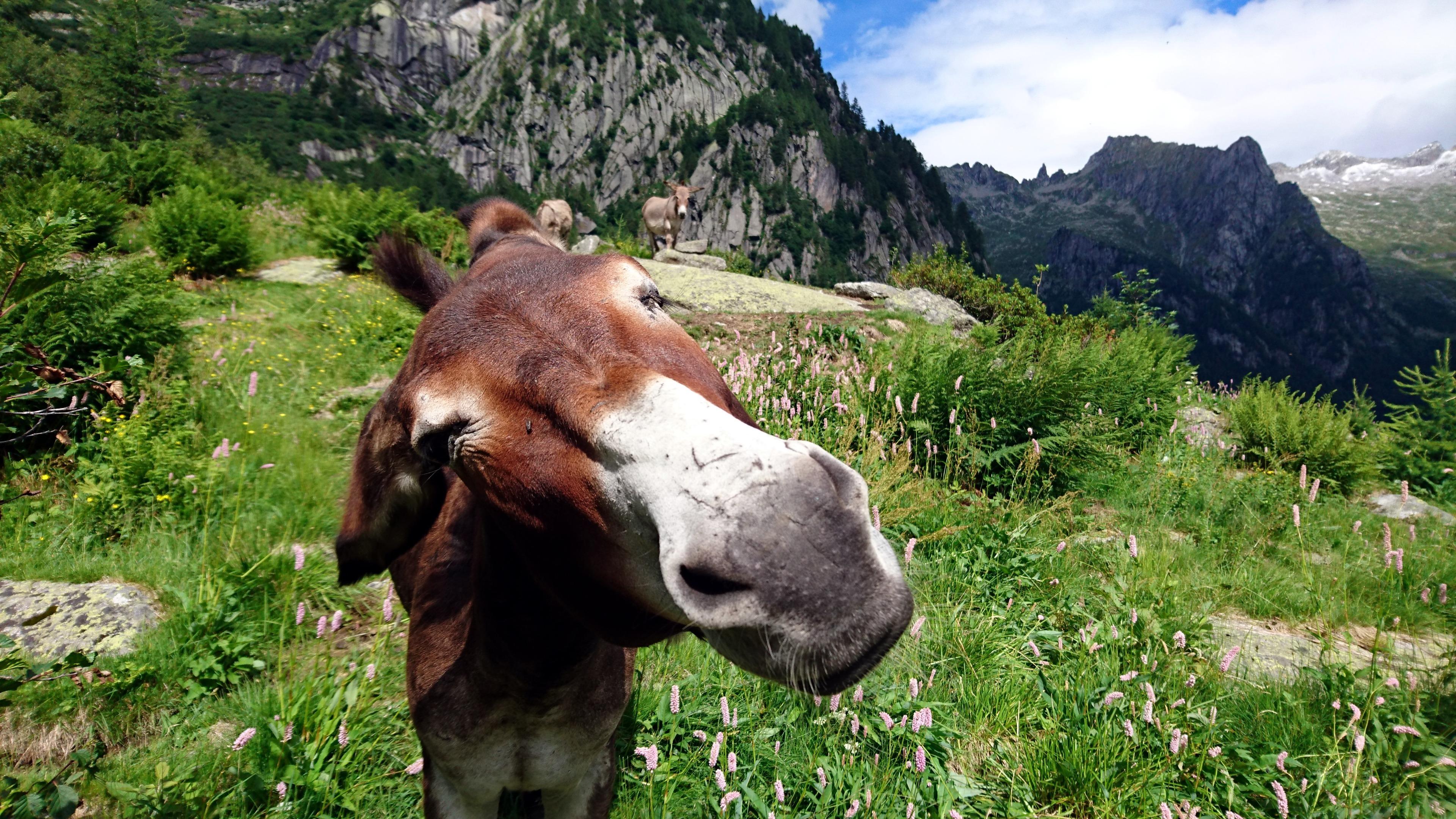 Traversando la valle dell’Oro, anch’essa bellissima con le placconate e il verde brillante dei prati, ci dirigiamo verso il rifugio Omio che si vede in lontananza: incontriamo altri asini, ma questa volta non ci fregano, l’obiettivo è sempre davanti ai nostri occhi e già pregustiamo una cena in quota. Peccato che l’Omio sia chiuso, causa sopravvenuta nuova gestione e conseguenti lavori: se ci fossimo arrivati a pranzo, come da programmi, ci saremmo rimasti malissimo! Non ci resta che scendere, non senza prima esserci fatti suggerire la location per la sospirata cena da due climber ospiti del bivacco invernale del rifugio…