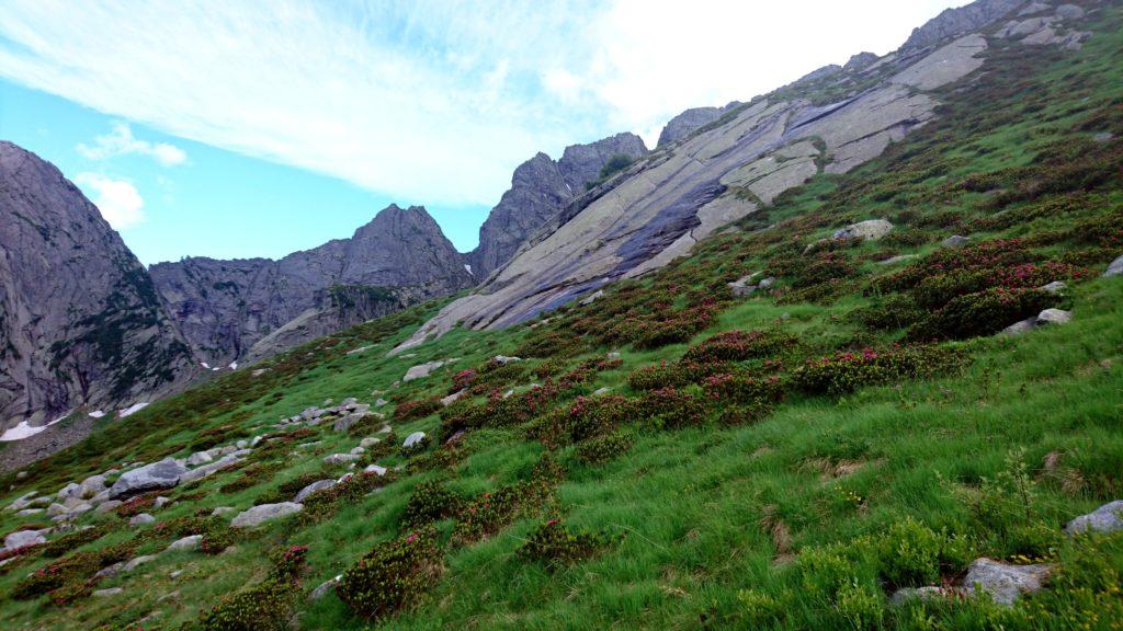 Il sentiero da qui in poi è ben segnalato per bolli anche se non è molto battuto e ci si ritrova spesso a camminare tra i rododendri, senza seguire una vera e propria traccia.