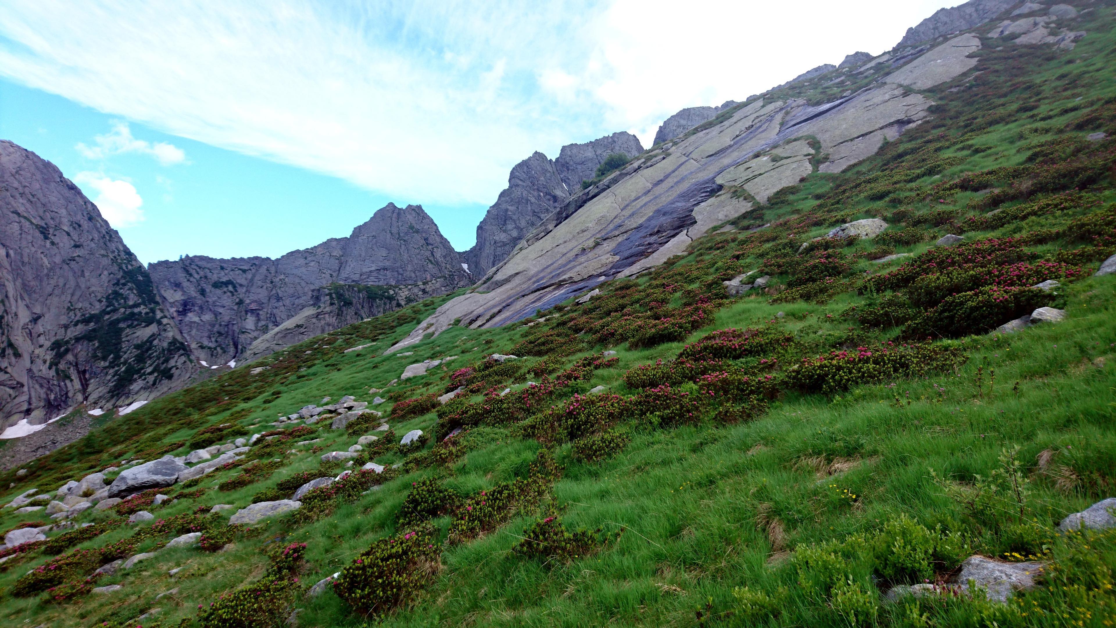 Dopo un paio di cambi di direzione, il sentiero inizia a risalire più verticale portandoci fuori dalla vegetazione e conducendo fino alla tanto agognata alpe della Merdarola, posto incantevole dove si può procedere tra splendidi rododendri in fiore fino ad una prima baita in pietra attorno ai 1950mt.
