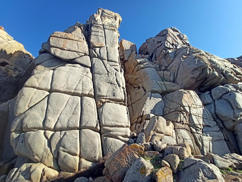 Tuttavia… è una sezione di costa dalla bellezza unica: un altro mondo, un mondo a parte rispetto alle falesie di calcare a picco sul mare che ci sono poco più a sud o lungo la costa orientale sarda. Ma si potrebbe quasi dire, un mondo a parte in generale. Il granito qui costruisce forme morbide, senza spigoli, grossi solidi geometrici solcati da fessure nette che ricordano i quadri di Fontana… a noi ha richiamato alla memoria quanto abbiamo visto in Namibia, in un luogo particolare, lo Spitzkoppe (potete vedere tutte le foto qui). Non sappiamo cosa abbia prodotto un simile particolare risultato, ma se ne avete idea… scrivetecelo!