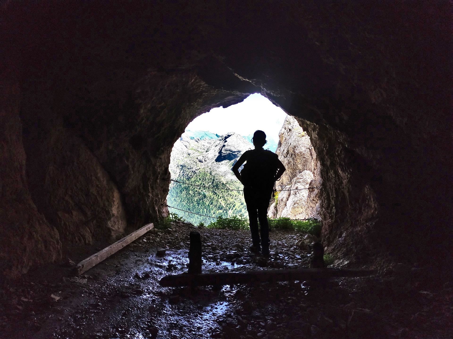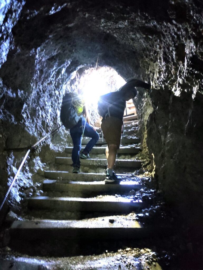 Tornando sui propri passi si raggiunge la galleria e si comincia a salire, ripidamente, su terreno umido e scivoloso, al buio di tanto in tanto intervallato dalle aperture scavate nella roccia, che offrono scorci meravigliosi sul paesaggio circostante. Tanta bellezza e così tanta sofferenza, insieme, nel cuore della montagna…