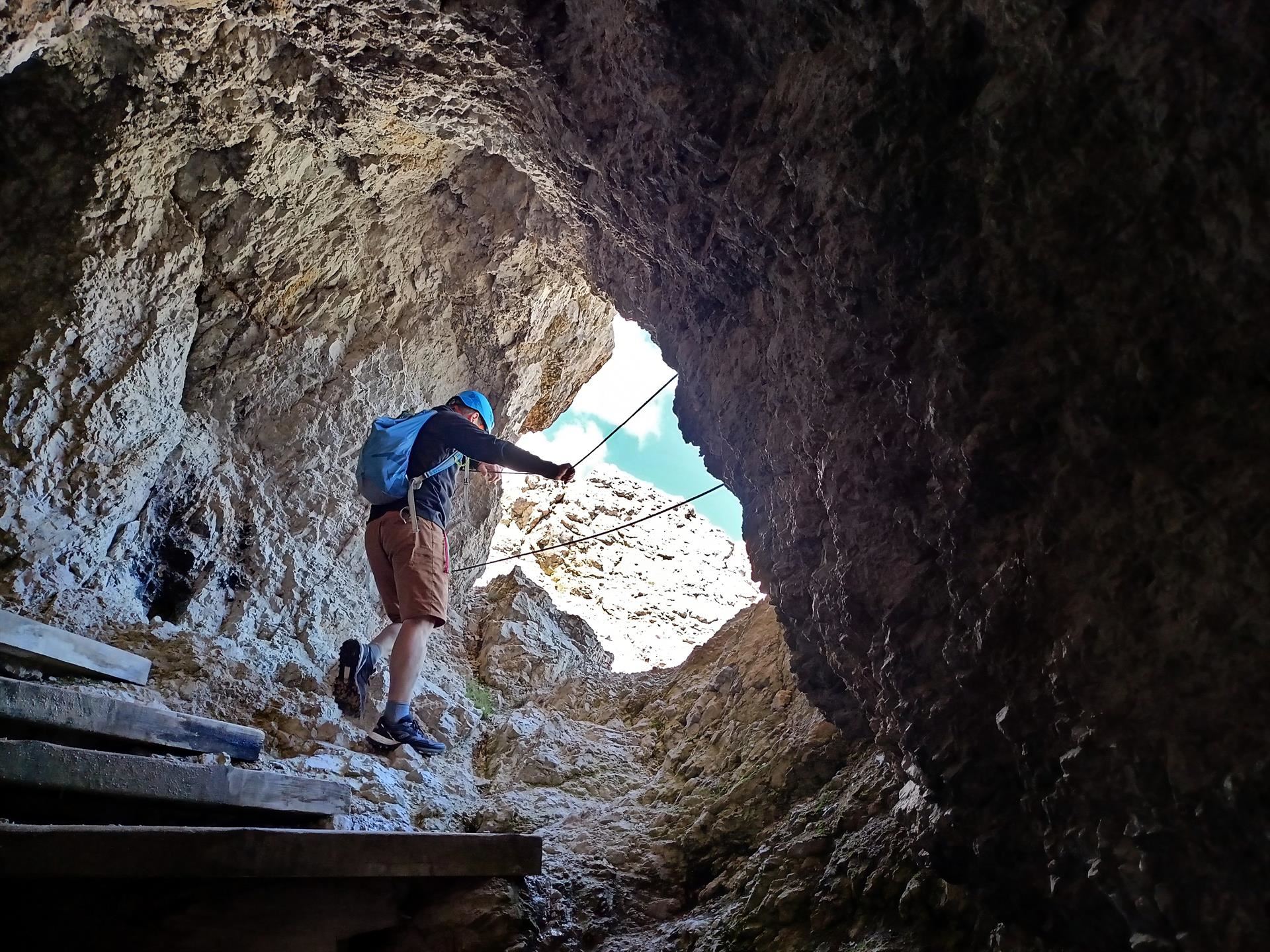 Noi abbiamo inanellato questo percorso con una arrampicata classica che ci ha depositato direttamente sulla Cengia Martini, poi, corde in spalla, siamo saliti fino in cima attraverso la stupefacente galleria che percorre il cuore della montagna.