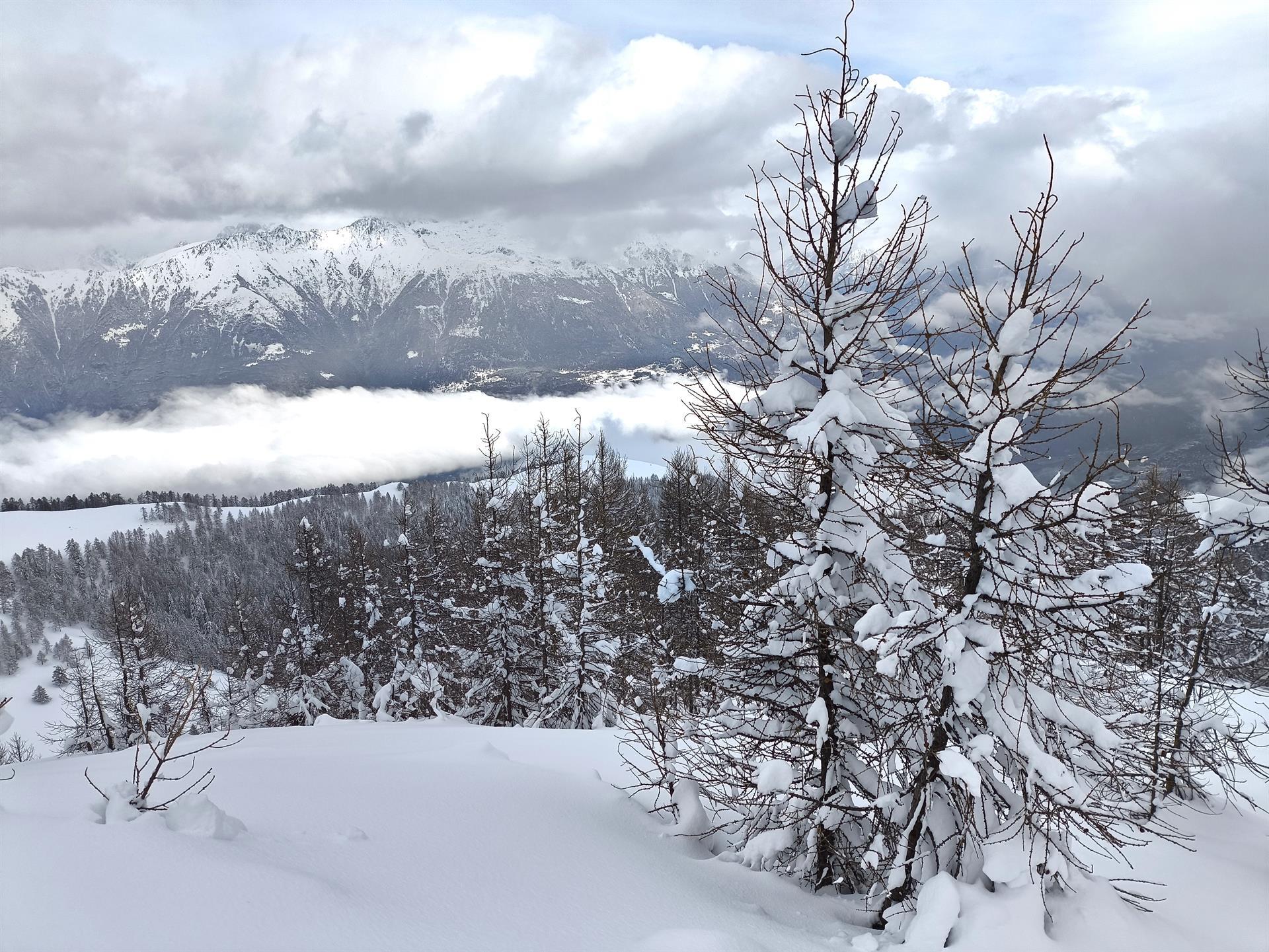 Da qui e fino a quando le pendenze rimangono moderate, si può stare nell’ampia valle passando accanto ad alcuni alberi isolati per poi piegare decisamente a destra in direzione della cresta e del bosco che va risalito direttamente seguendo la spalla Nord-Est della montagna.