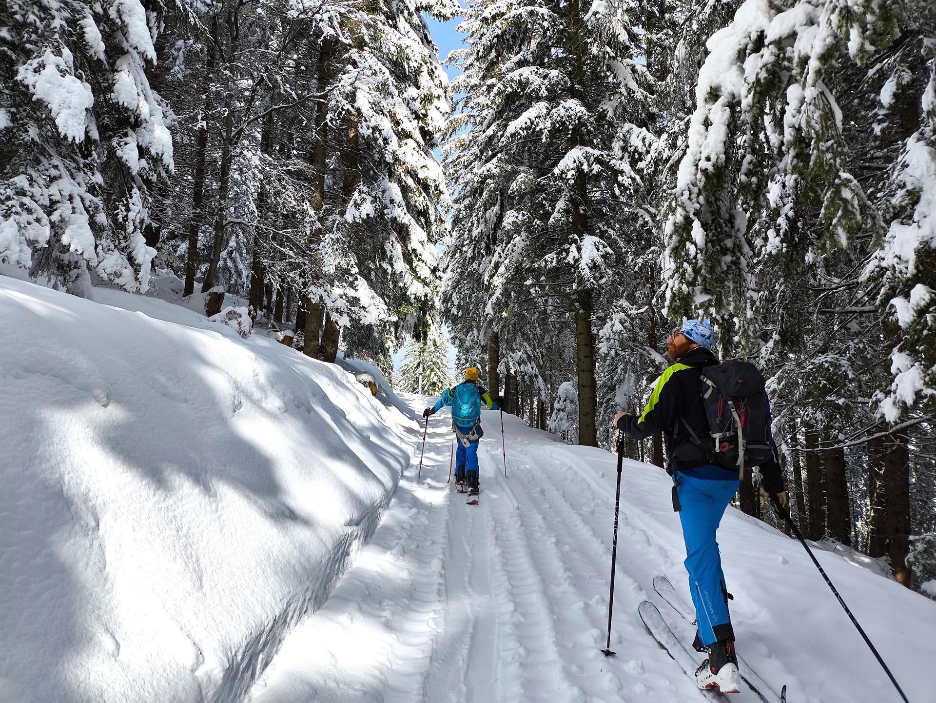 A prescindere da come ci arriverete (a piedi, con le pelli o in auto), dovrete proseguire su strada o sfruttando alcuni tagli nel bosco fino al Bar Bianco che si trova a quota 1.520 m, quindi circa 400 metri di dislivello oltre la sbarra e 4,2 km di sviluppo.