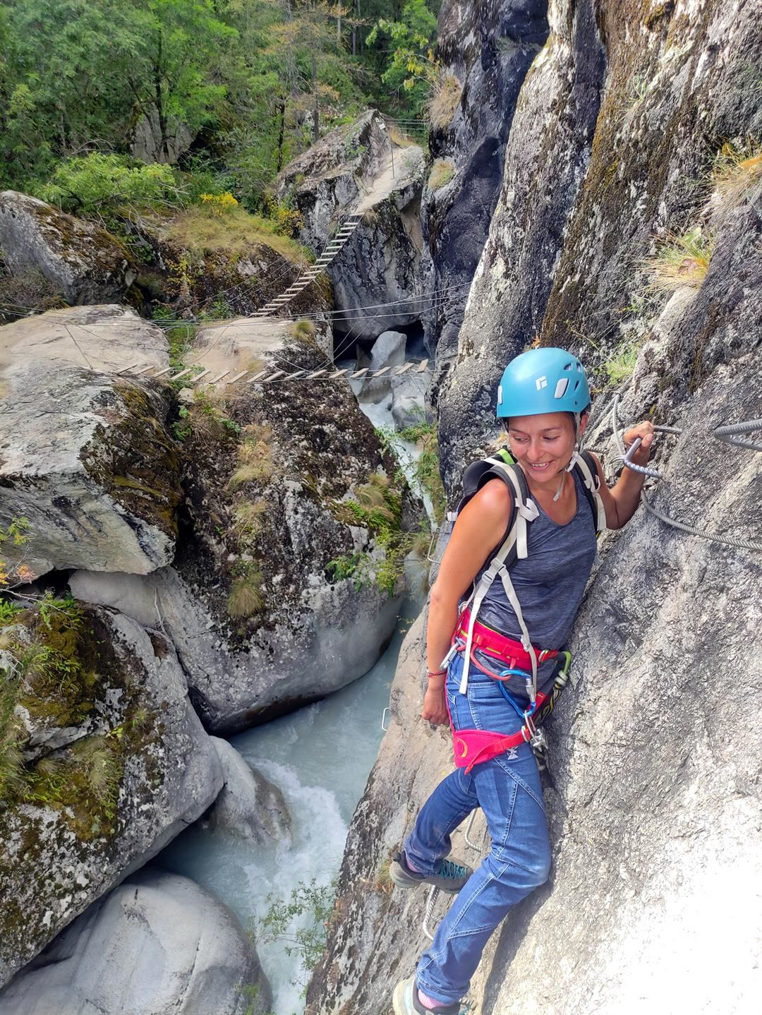 Incuriositi, abbiamo dato un’occhiata ed ecco che salta fuori questa ferrata, molto particolare e sicuramente spettacolare, di cui non sapevamo nulla! In realtà è molto gettonata nella zona, ma per noi che eravamo qui per scalare è stata una sorpresa. Avendo a disposizione qualche ora dopo una via multipitch che ci aveva un po’ deluso (“Crash pad dans la soupe” al settore Gramuson… ecco, ora lo sapete 😉 ) abbiamo deciso di darle una chance… e abbiamo fatto bene!