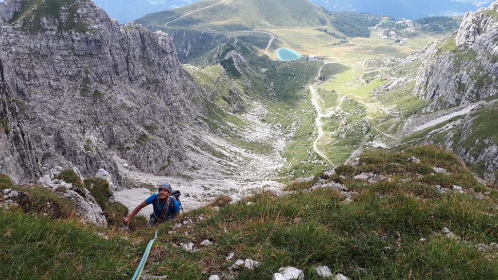 - IV / II (35mt) – Salire la placca procedendo in diagonale da destra verso sinistra fino a raggiungere il facile spigolo che conduce ad un ampio terrazzo erboso. Raggiungere poi la parete successiva dove si trova la sosta della variante (fare sosta lì e spostarsi dopo per far lavorare meglio la corda).