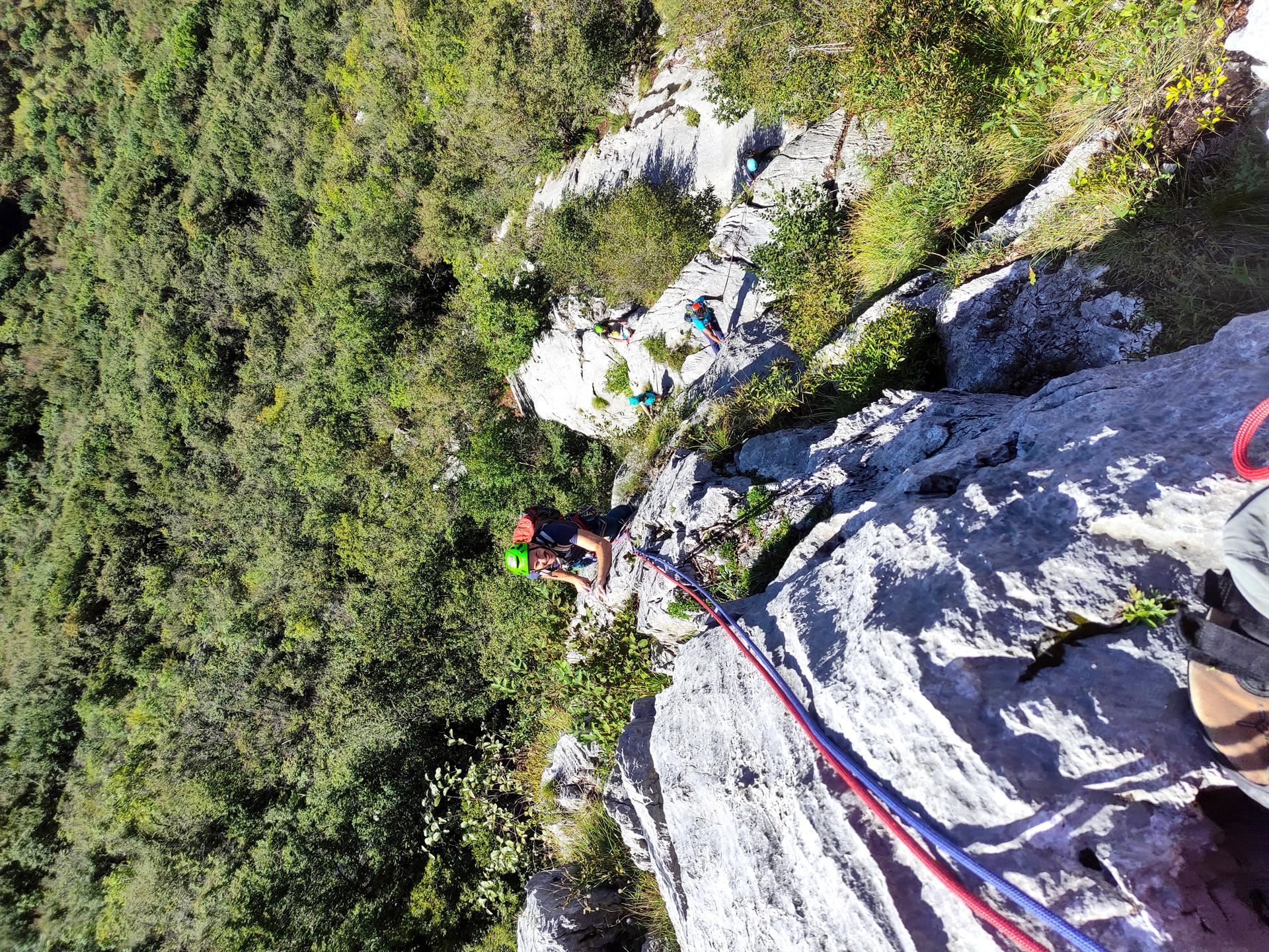 - 5b (25m) – Placchetta con rocce lavorate all’inizio, poi si trova un bivio dove noi abbiamo seguito gli spit di destra che passano sotto una spalla strapiombante con passettino in placca delicato, poi ci si sposta a destra verso una presa più generosa e si sale l’ultima paretina verticale in spigolo con buone mani fino alla sosta.