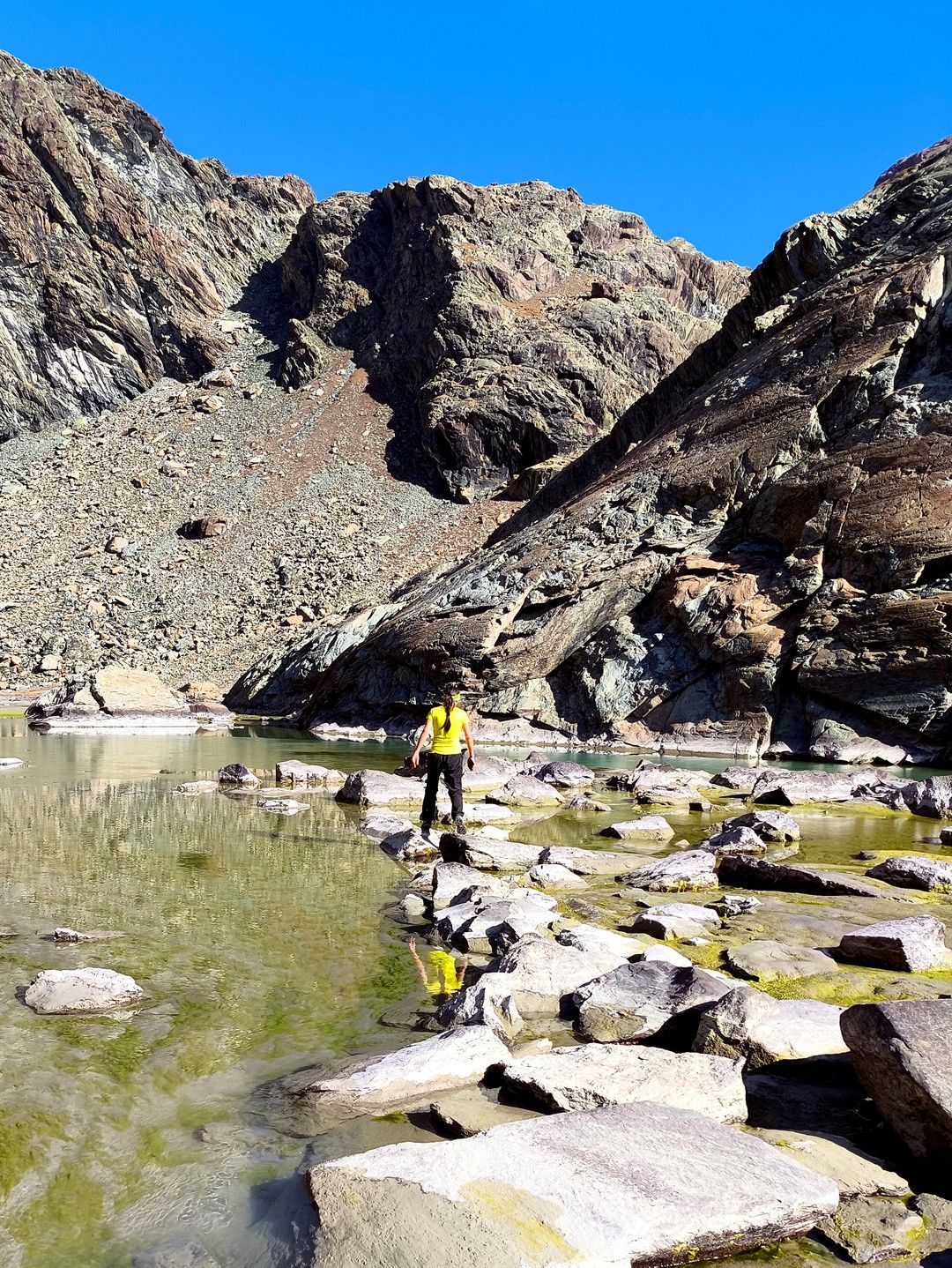 Noi ormai avevamo valutato che non avevamo il tempo di raggiungere il lago alto, anche perchè gli amici erano rimasti a valle e non avremmo voluto farli aspettare, quindi ci siamo diretti verso il laghetto basso: seguendo la traccia ci si incunea nel letto sassoso di un torrente, che scorre sotterraneo, risalendo dapprima un piccolo muro di roccia. Superato il risalto del torrente si arriva in una valletta in quota con grossi massi in cui il sentiero prosegue sulla destra orografica: non avendo intenzione di raggiungere il passo siamo scesi al laghetto.