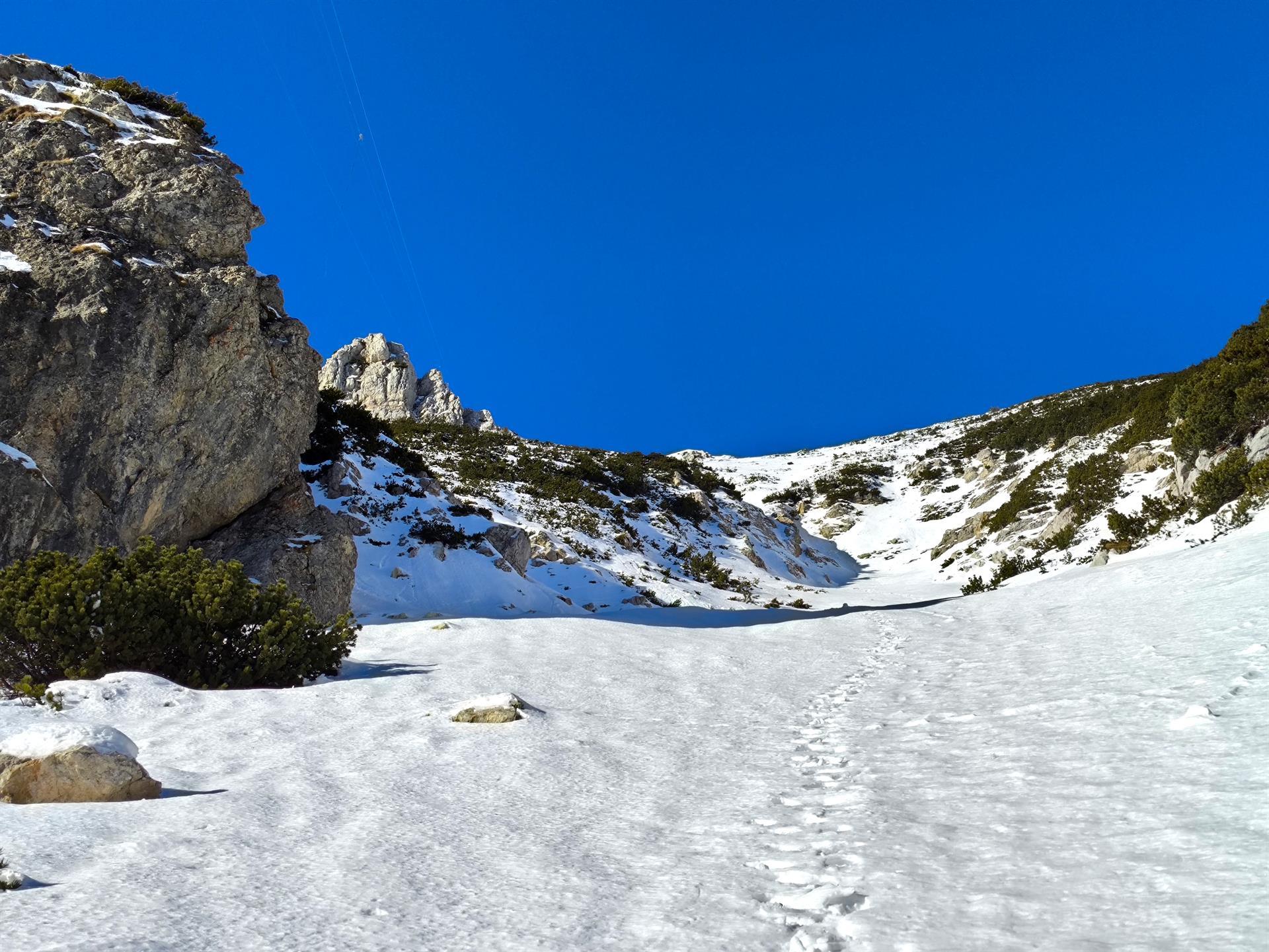 Si supera un avvallamento e con 4 o 5 lunghi zig zag tra i mughi, si raggiunge una radura con vegetazione più rada alla destra della quale si vede evidente l’attacco del canalone, verso il quale si dovrà deviare nel punto di attraversamento più comodo (1h e 15/30 dall’auto).