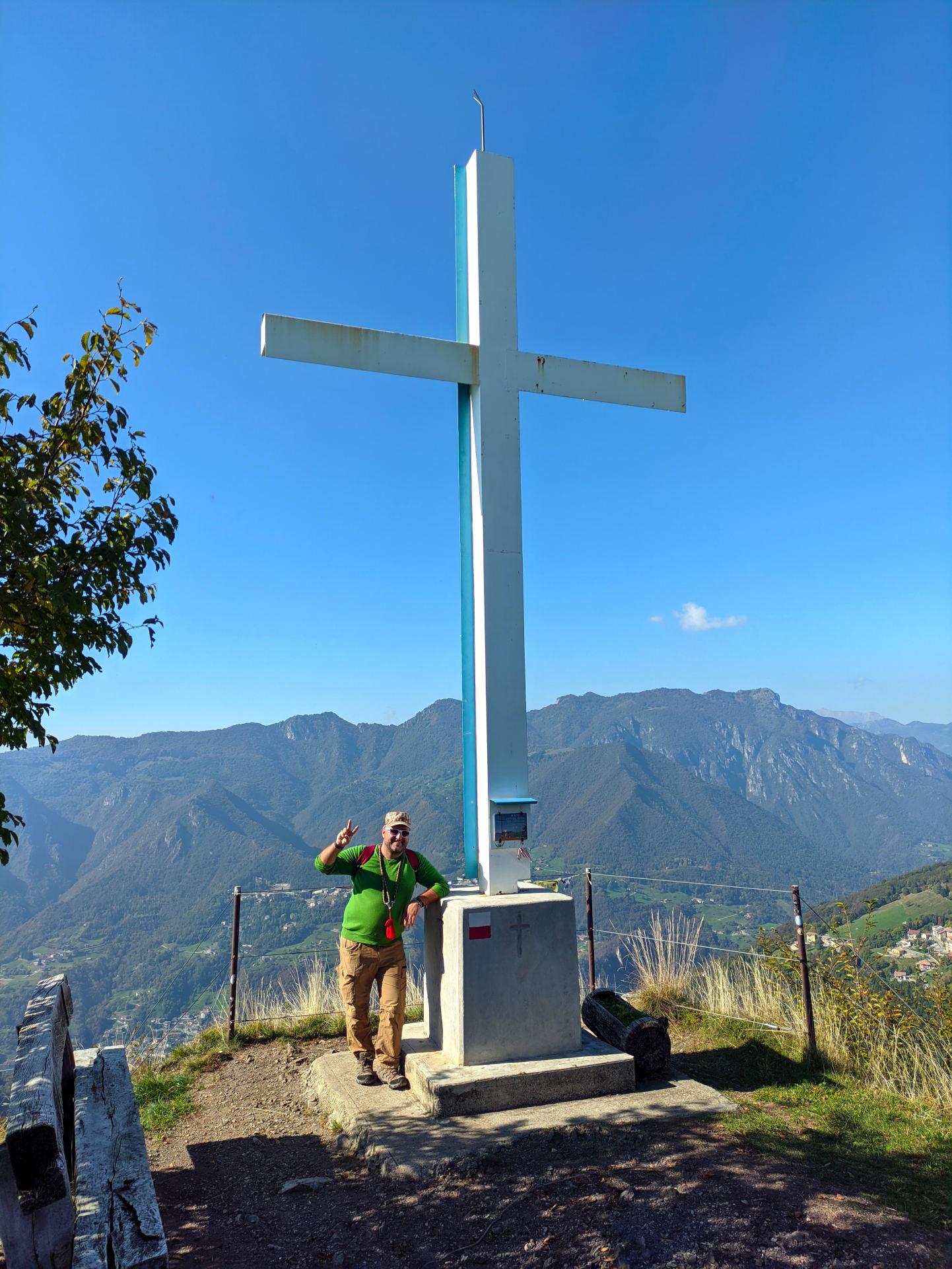 Terminato il momento di gioco sulla panchina, basta proseguire in cresta per pochissimi minuti e si raggiunge la cima del Monte Corno (1030mt) con la sua imponente croce.