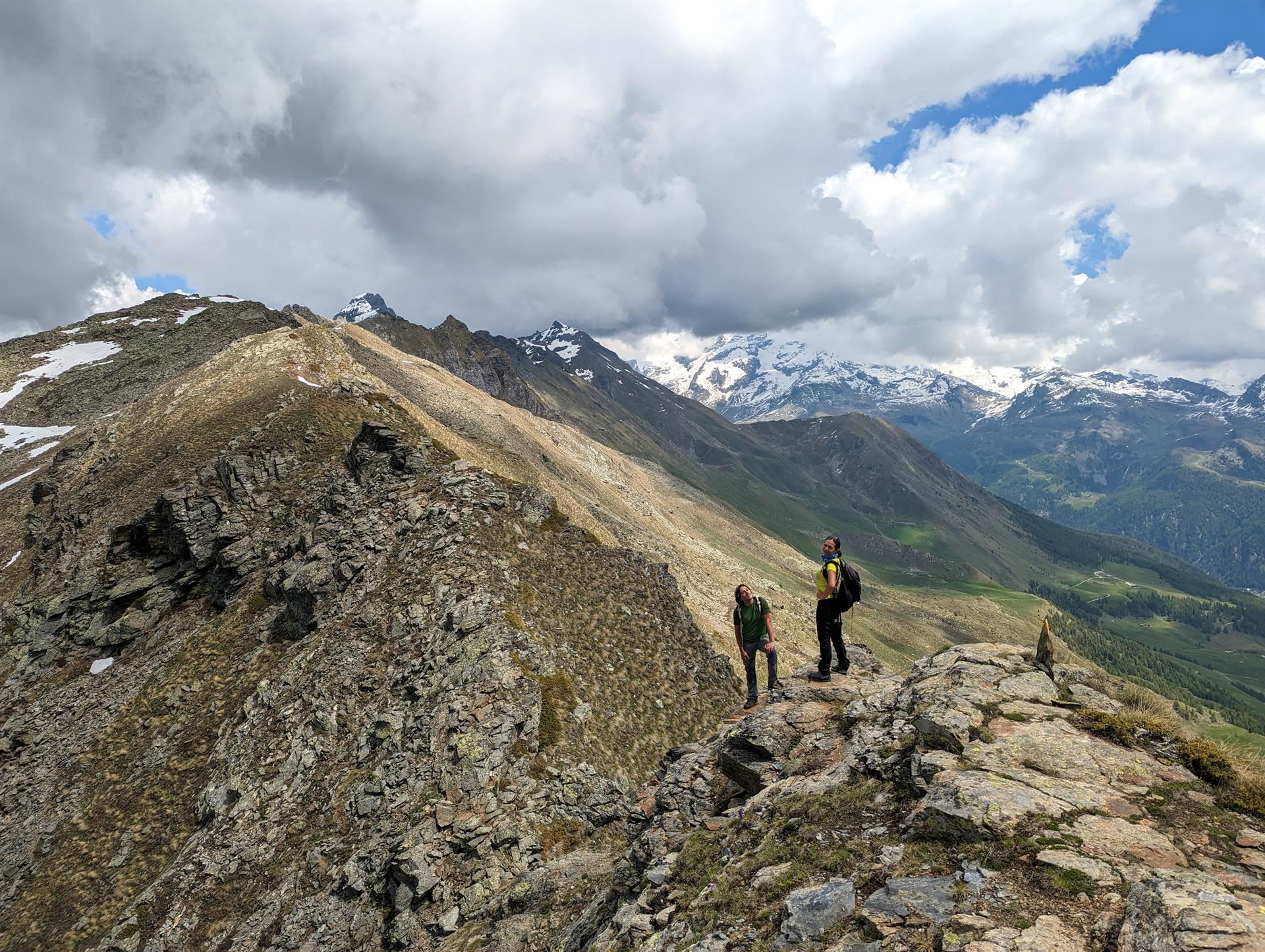Raggiunta la cima però, se si decide di proseguire in cresta verso nord, bisogna tenere presente che si incontrerà qualche tratto esposto, alcuni passaggi su roccette e tratti attrezzati con catene e staffe, oltre ad alcuni possibili attraversamenti su neve (a seconda della stagione). Se volete farvi un’idea più precisa del tipo di terreno guardate le foto!