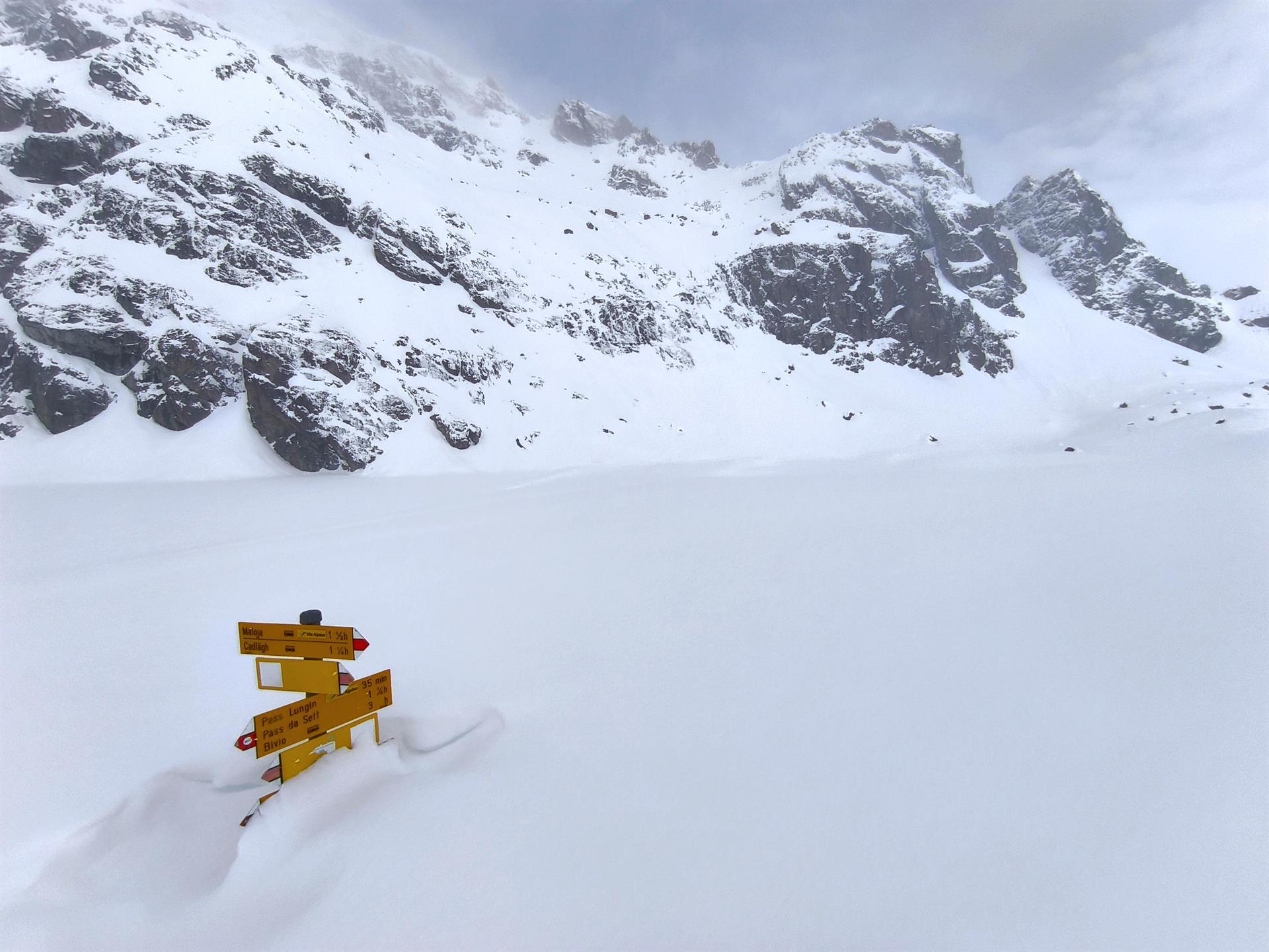 Seguendo i pendii più dolci si arriva quindi all’altezza del lago di Lunghin, a quota 2.500 m circa dove troverete alcuni cartelli indicatori e il grande lago coperto di neve.