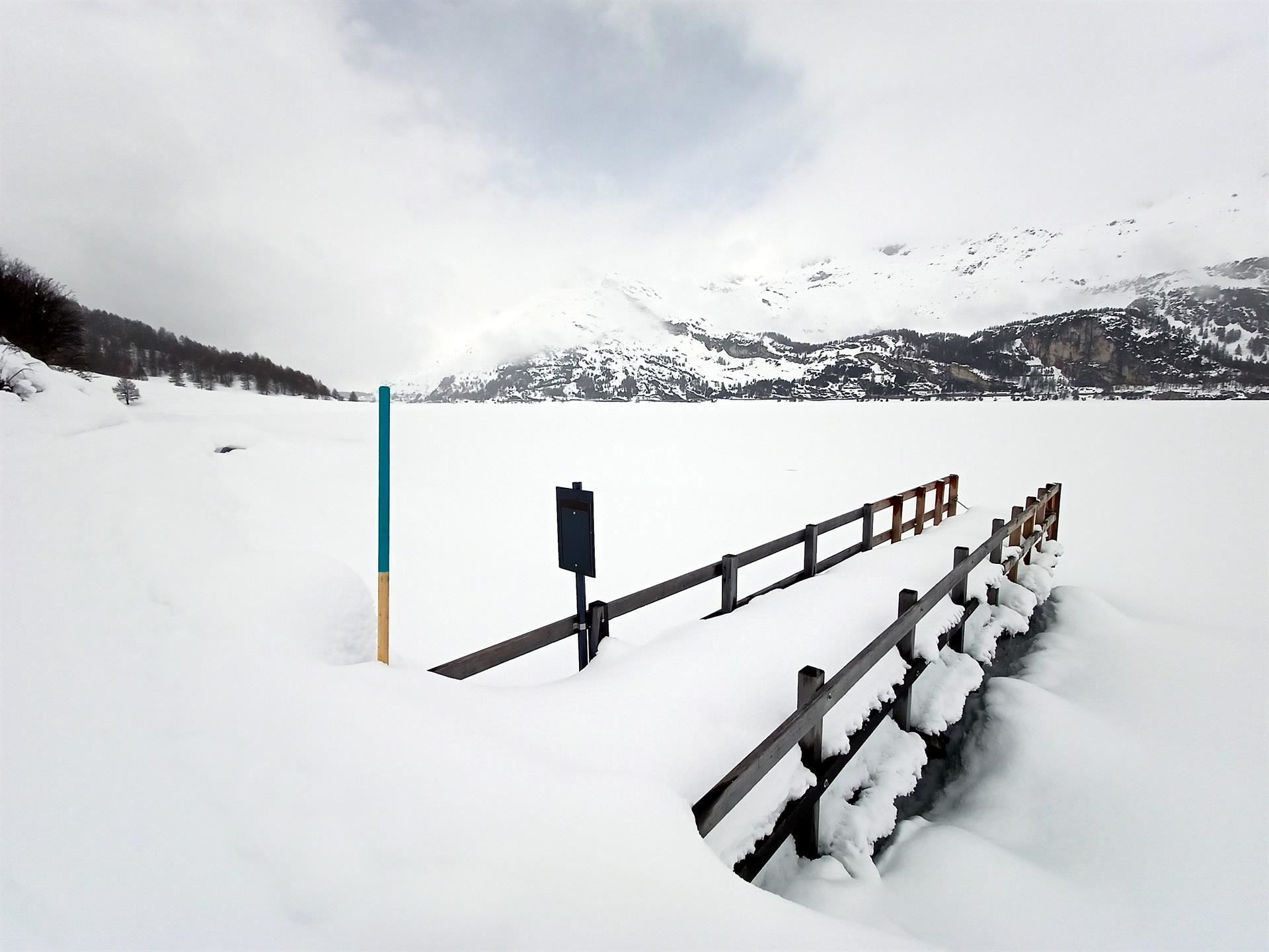 Da Maloja a Isola lo sviluppo è di circa 3,5 Km, non pochissimo considerando di dover tracciare in neve fresca e di dover poi tornare indietro per altrettanti chilometri (o proseguire verso Sils im Engadin per altrettanti). Il rientro, assolutamente solitario, è stato epico: complice l’assenza di anima viva, le nuvole basse e il whiteout dovuto al nevischio, ad attraversare in diagonale il lago sulla sua superficie piatta e continua sembrava di essere gli ultimi sopravvissuti sul pianeta. A intervalli, il miraggio di una panchina che sembra essere collocata in mezzo al nulla e un paio di moli da cui natanti invisibili sembrano dover salpare per chissà dove. Poesia!