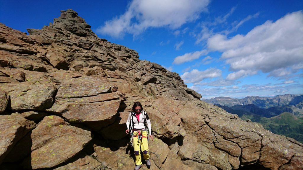 Al termine del camino, si esce a sinistra su una cengetta e poi si prosegue in verticale con facile arrampicata fino ad un diedro/fessura verticale di circa 3 metri. Si risale quest’ultima difficoltà (state all’esterno usando il diedro con un piede sulla destra se non volete fare fatica) fino all’ultima sosta, dalla quale si può finalmente rilassarsi, mettere via l’attrezzatura e prepararsi per gli ultimi 50 / 100 metri che si risalgono per roccette cercando la via più facile, fino alla vetta.