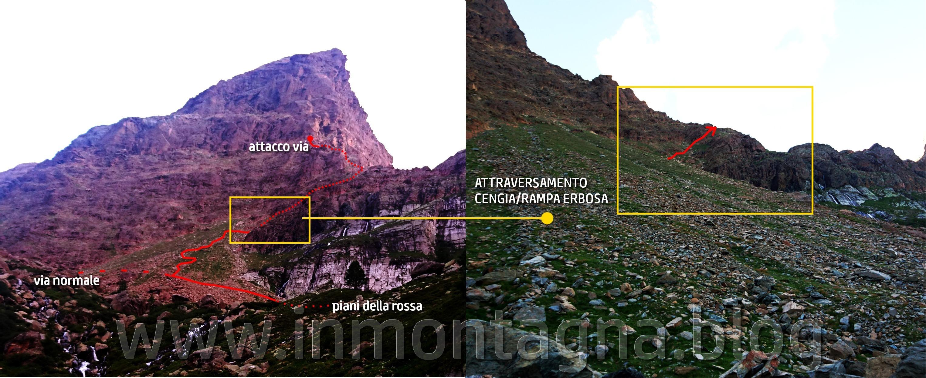 Si imbocca a sinistra, seguendo il sentiero che entro breve inizia a salire lungo una pietraia. Procedere per ometti lungo i sassoni fino ad arrivare ad un punto in cui sulla destra è possibile risalire un lungo pendio erboso, intervallato da sfasciumi. Il pendio in questione si trova poco dopo le evidenti cascate che si vedono sulla destra, a circa 10-15 minuti di cammino dai Piani della Rossa.