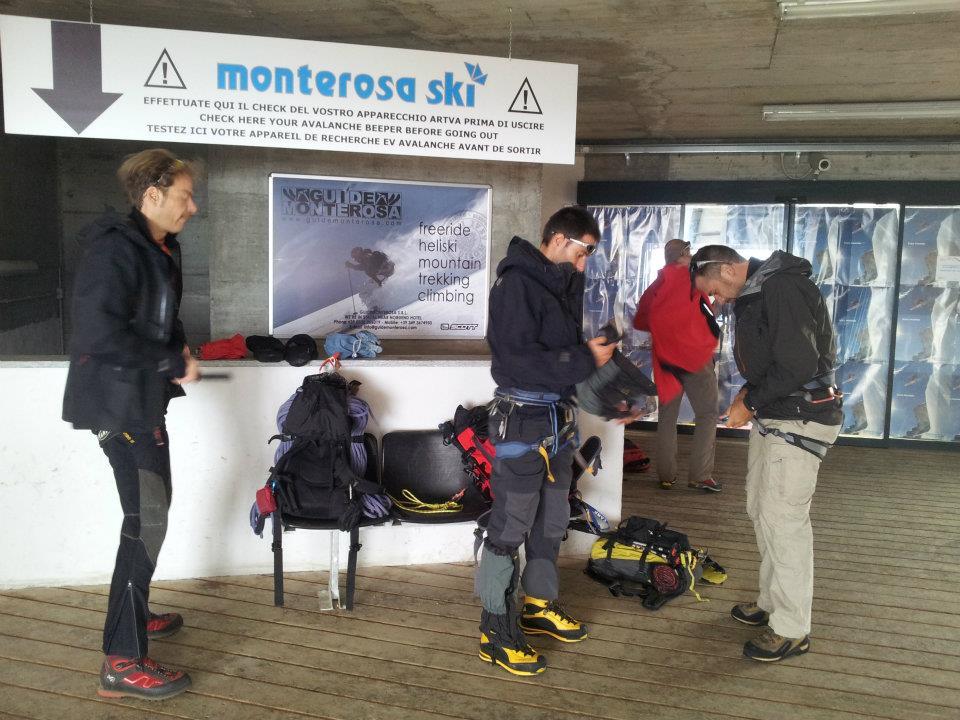 Arrivati a Punta Indren con la Funivia si prepara la cordata e si inizia a seguire in direzione Nord-Ovest fino a salire sul ghiacciaio di Indren che va poi risalito verticalmente dopo aver incontrato i resti di un vecchio impianto.