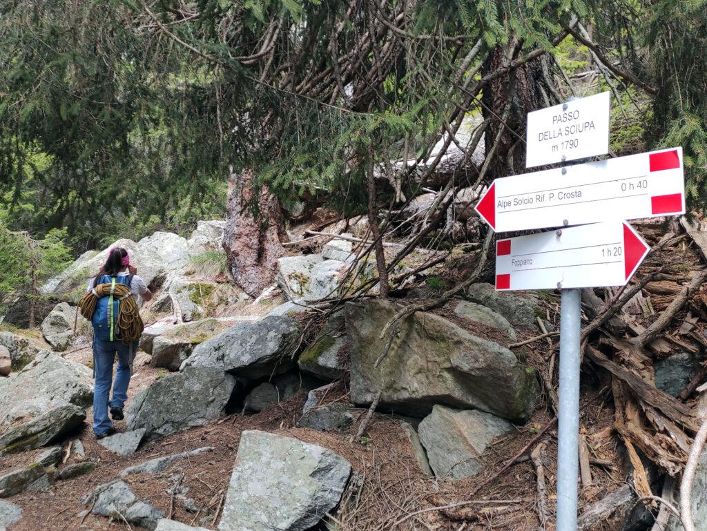 Dal parcheggio noi abbiamo seguito il sentiero sbagliato che è quello verso la Colmine e la bocchetta del Lupo. Dopo poche decine di metri, arrivati ad un prato con un cartello abbiamo invece preso la strada a monte che conduce fino alle ultime baite della frazione Foppiano e dietro all’ultima casa di pietra abbiamo trovato l’attacco del sentiero che porta al passo della Sciupa.