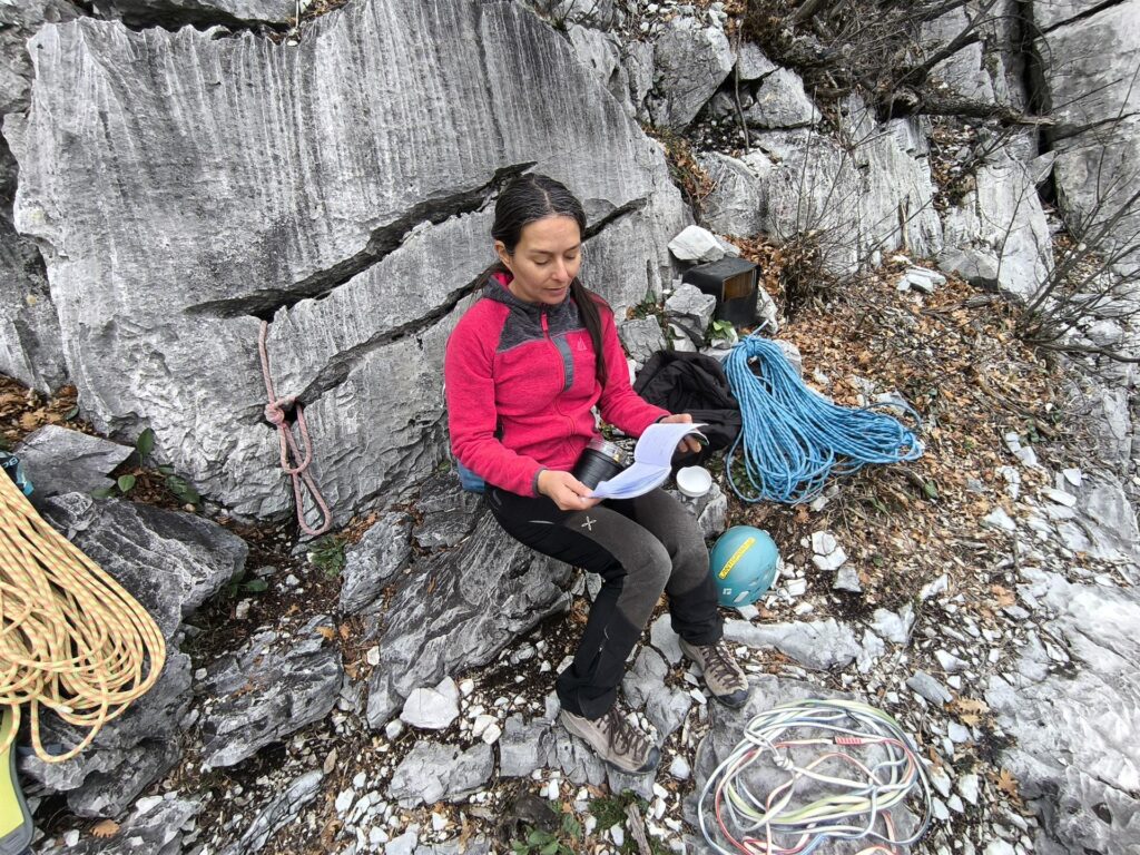 - L2 – II / III (15m) – Dalla sosta abbassarsi leggermente alla propria sinistra ed iniziare a traversare su terra e detriti (per fortuna è protetto) per una decina di metri.