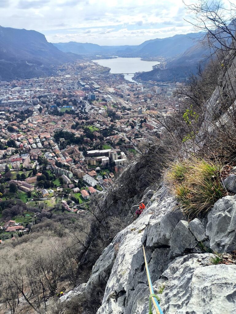 Entrambe le vie hanno un sapore di montagna, soprattutto in alcuni passaggi: l’esposizione di Tutto di traverso non è paragonabile a quella dell’altra via però! Ne guadagna il panorama: in Tutto di traverso si arrampica sospesi sulla città e sul lago, davvero notevole.