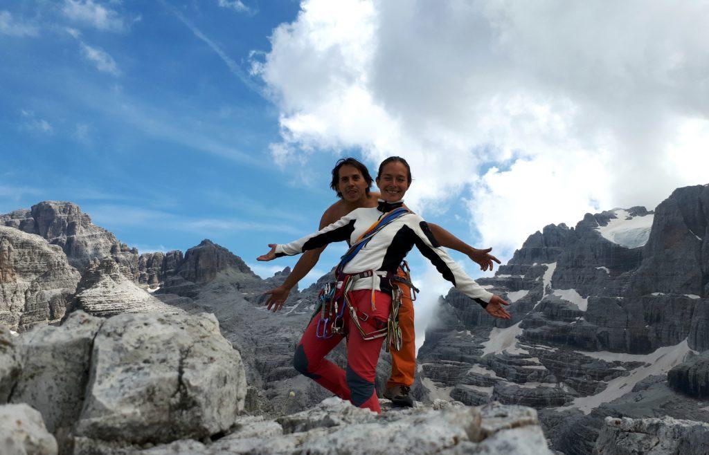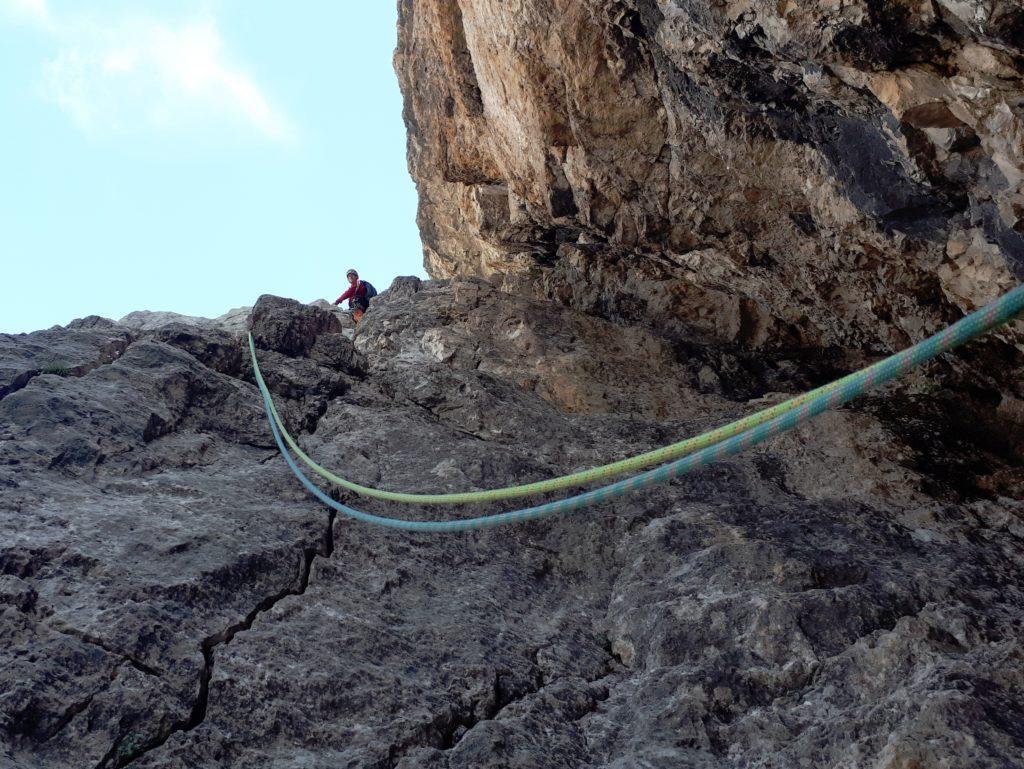 *ATTENZIONE! Nella Guida “Dolomiti di Brenta” vol. 3, Collana Roccia d’autore, ed. 2016 inspiegabilmente sono segnati solo 4 tiri… infatti arrivati alla fine del IV tiro, non vedendo la sosta (dal terrazzino con lo sperone non si riesce a scorgere perchè si trova dietro lo spigolo) ci è venuto il dubbio di aver sbagliato qualcosa, dubbio che fortunatamente è durato pochissimo!