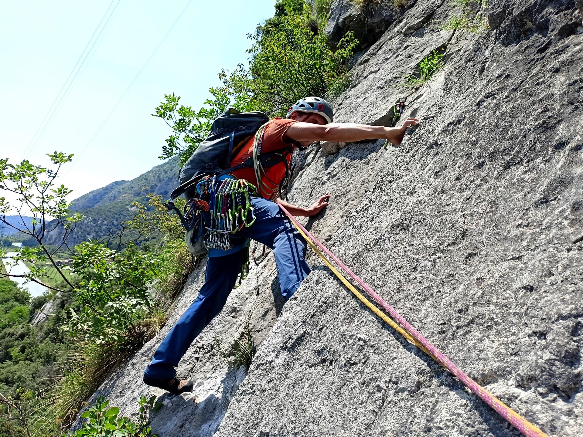Come sempre – o quasi – qui a Tessari il grado è piuttosto generoso: ne segue che l’arrampicata su queste vie è quasi sempre plaisir, anche se date come semi-trad.