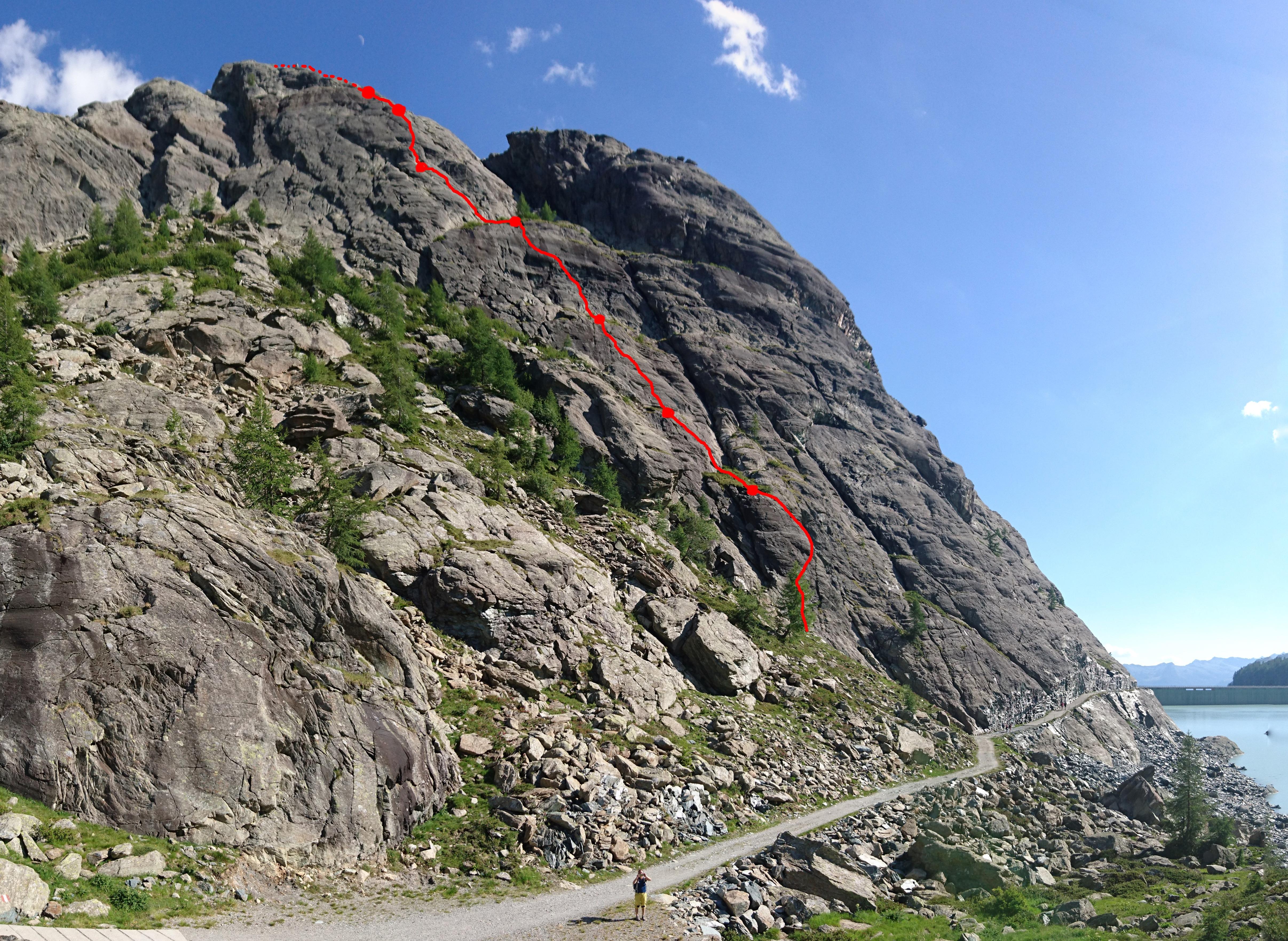 L’attacco della via si trova ad una ventina di minuti dal parcheggio basso della Diga: arrivati alla sua sommità essa non va attraversata. Si percorre il sentiero mantenendo la destra del lago, si supera una galleria scavata nella roccia e dopo una discesina su sentiero cementato, dove la parete alla nostra destra cessa di essere verticale, si risale per pochi metri il conoide detritico trovando l’attacco della via, subito dopo quello della Via Lilly (che si riconosce perchè alla sommità del primo tiro di quest’ultima si nota una conifera solitaria).