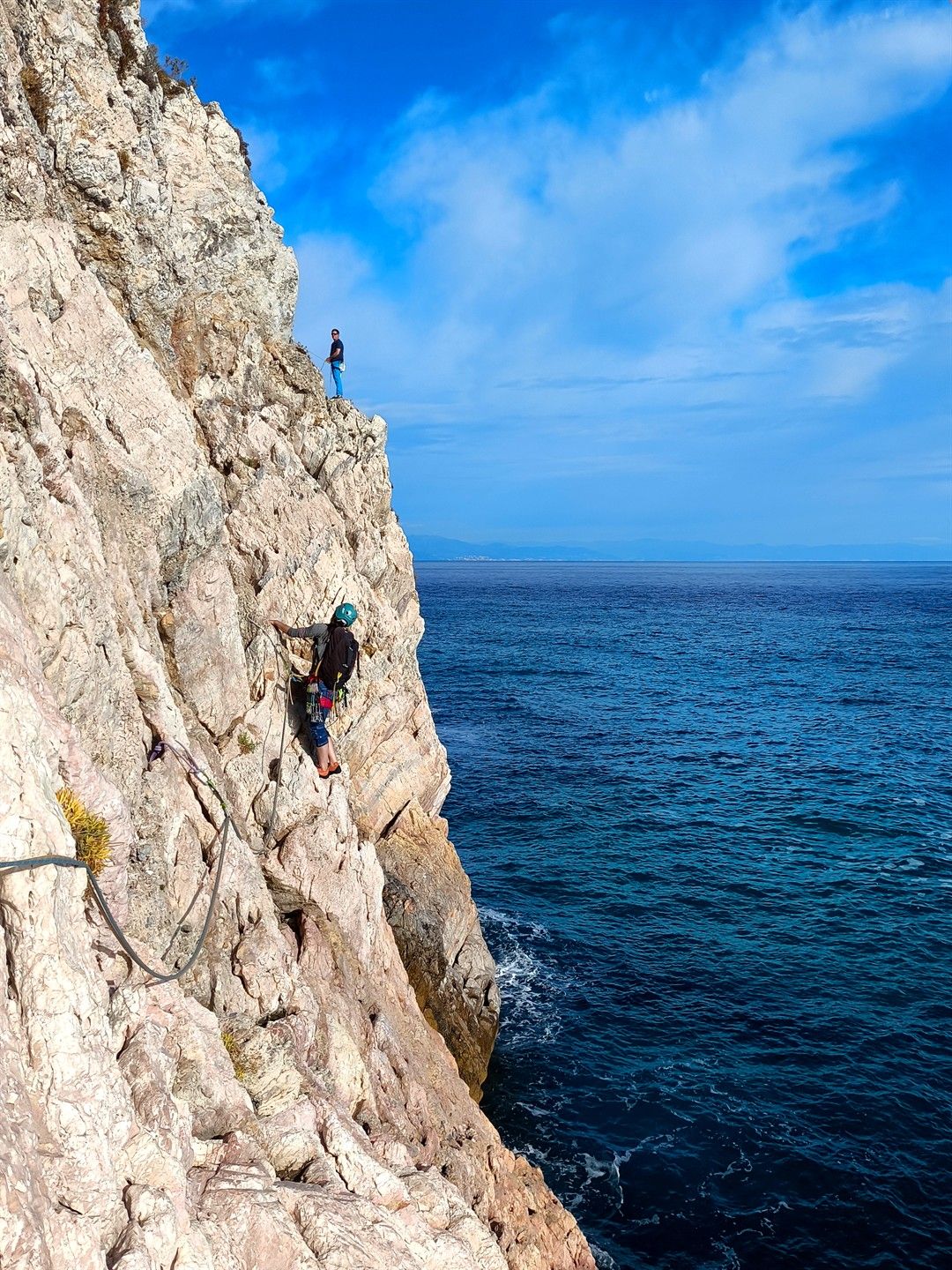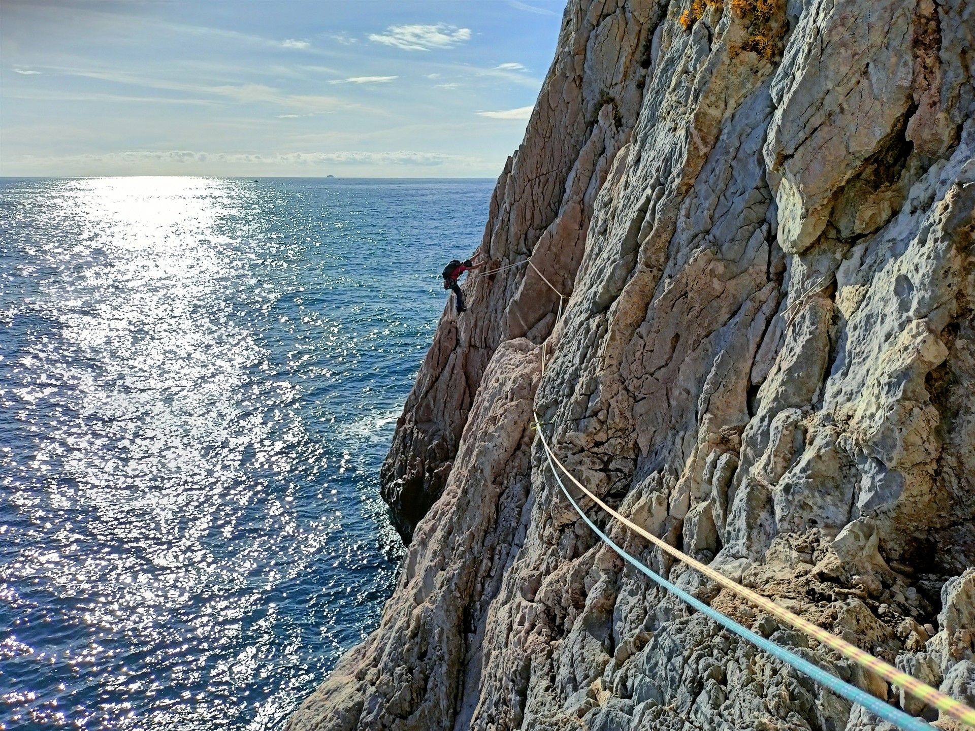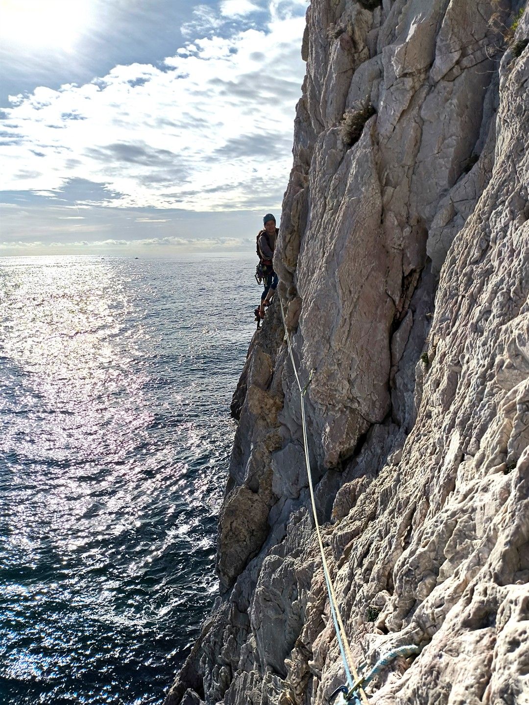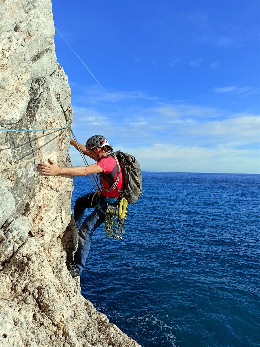 Fatte queste doverose premesse, la roccia è super (incredibile ma vero, il grip è fantastico e nel 90% dei casi è stabilissima), bella anche a vedersi con le sue sfumature perlacee, le protezioni in loco abbondanti (da verificare, anche per l’azione corrosiva della salsedine), in molti punti quasi si cammina… quindi goduria pura!
