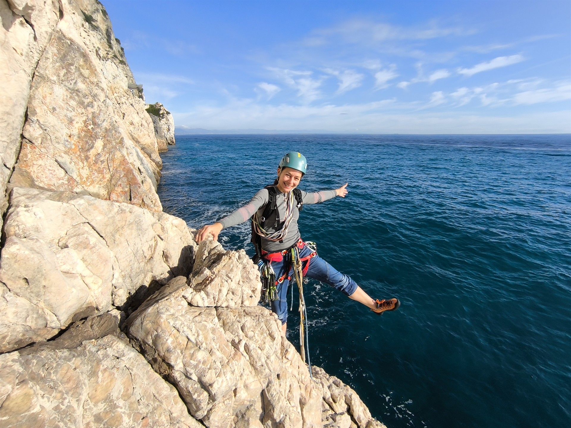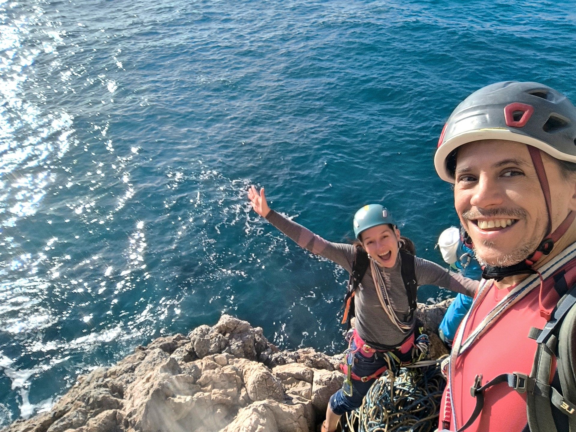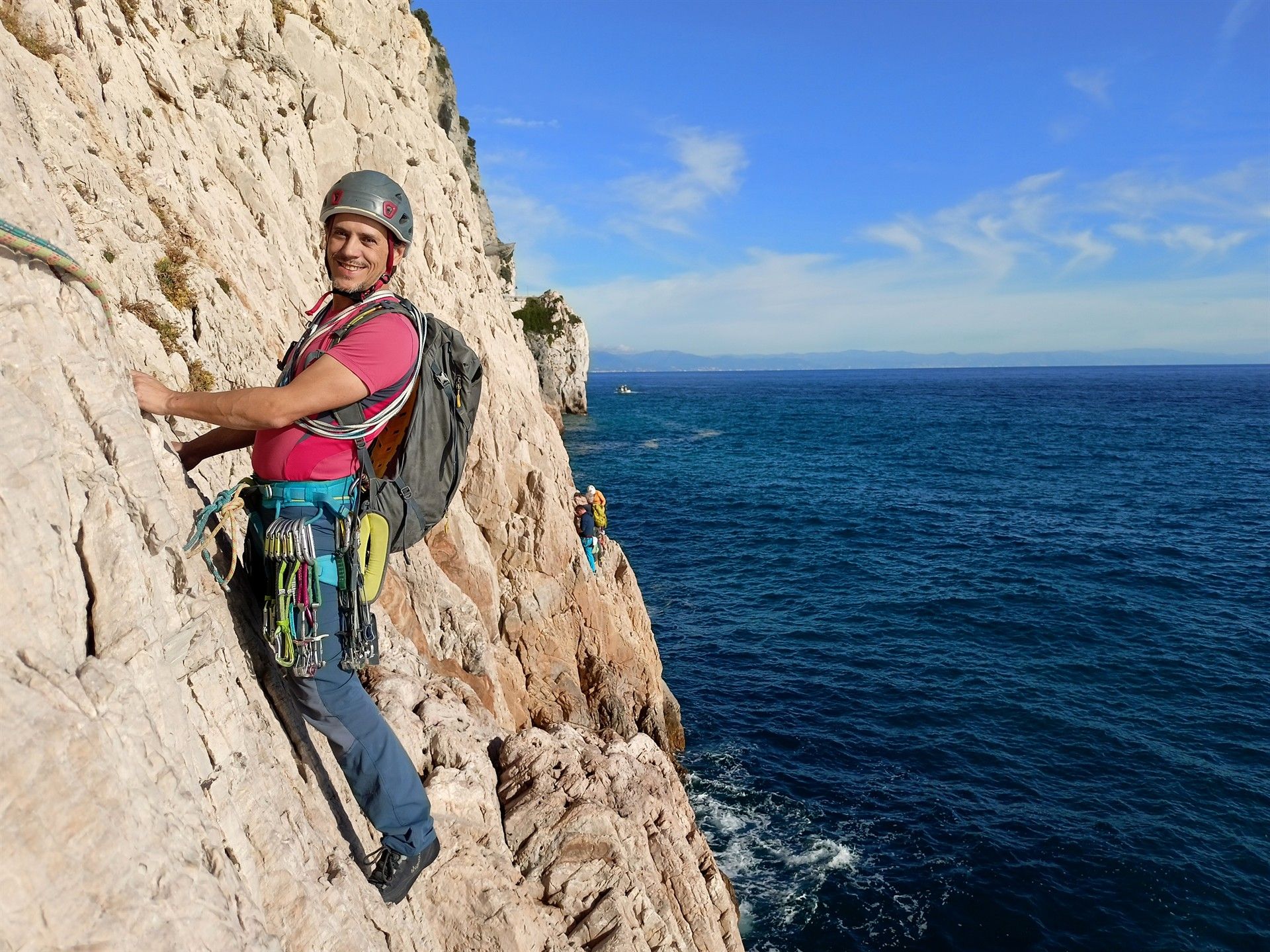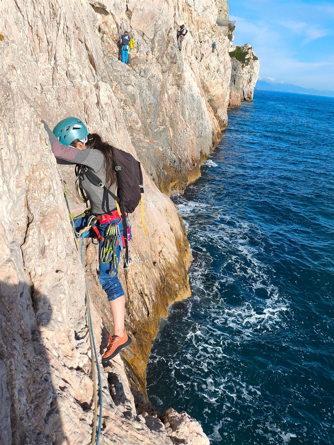 Fatte queste doverose premesse, la roccia è super (incredibile ma vero, il grip è fantastico e nel 90% dei casi è stabilissima), bella anche a vedersi con le sue sfumature perlacee, le protezioni in loco abbondanti (da verificare, anche per l’azione corrosiva della salsedine), in molti punti quasi si cammina… quindi goduria pura!