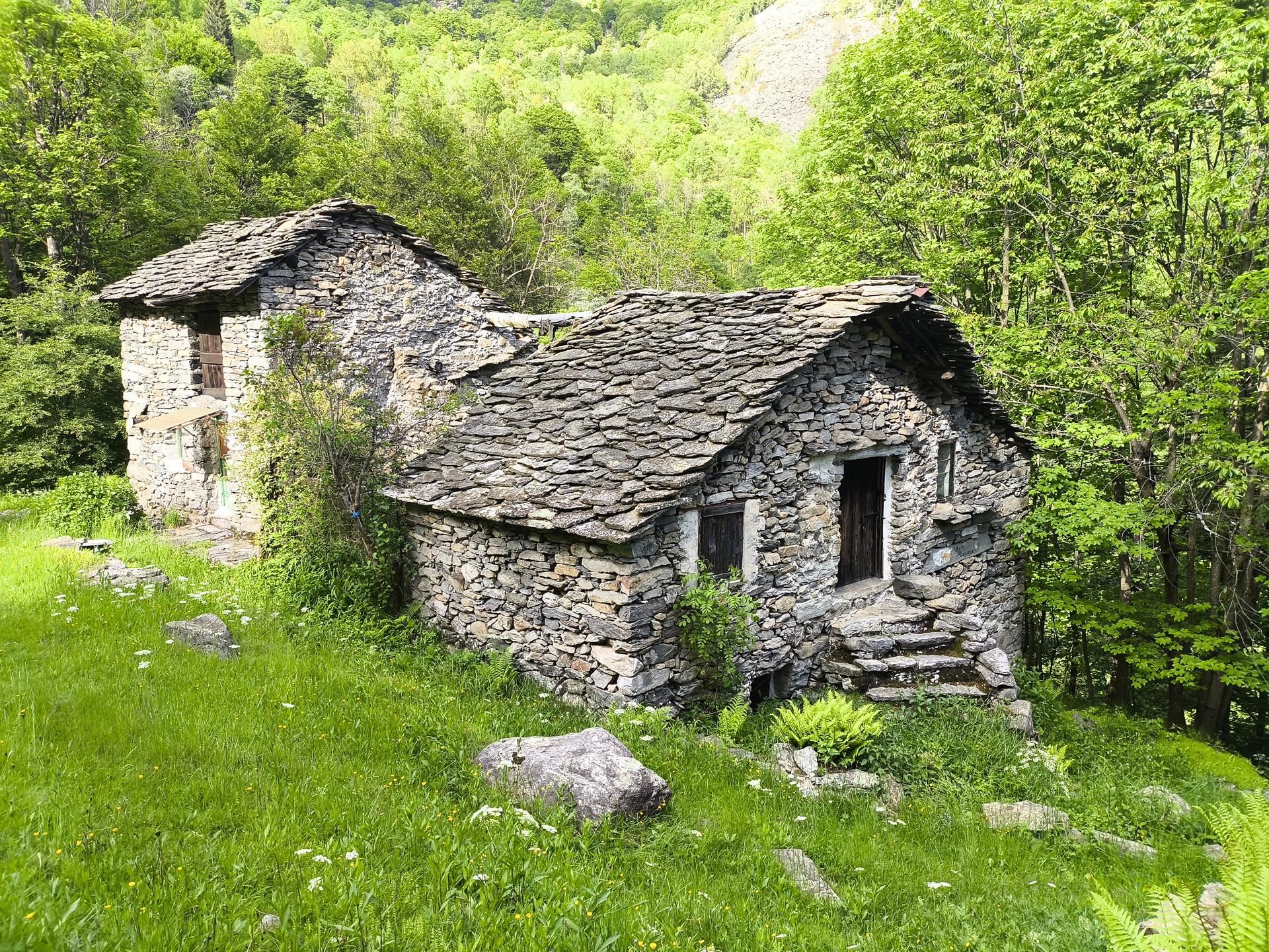 Proseguendo ignorando ogni deviazione sul sentiero principale si arriva dopo un po’ ad un agglomerato di baite anticipato da una piccola fonte, l’Alpe le Piane appunto. Si va oltre, sempre seguendo il sentiero in leggera salita, fino a vedere sulla sinistra una piccola cappelletta votiva ricavata tra le rocce: dopo questa e superati un paio di zig-zag di sentiero sulla sinistra si scorgeranno degli ometti, posti su un ghiaione.