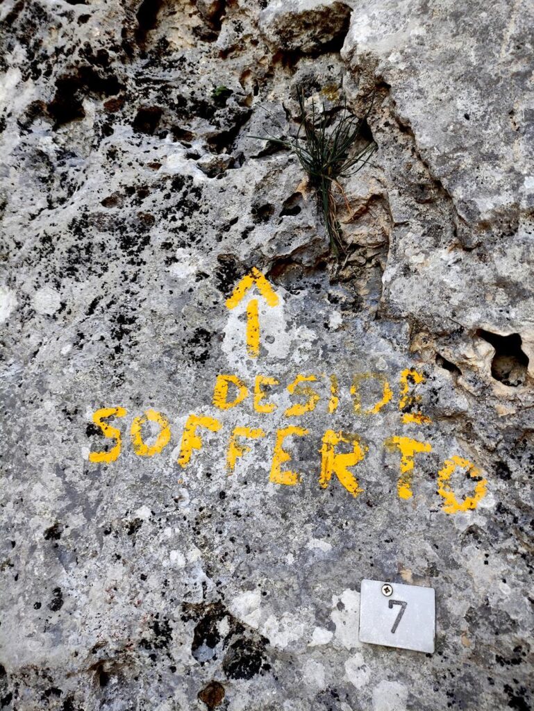Desiderio Sofferto è indicata dal numero 6 e parte tutto a sinistra della placca, appena sotto ad una roccia leggermente aggettante (con un dado incastrato sotto) ed è protetta da piastrine artigianali di colore blu, con ogni tanto qualche spit più nuovo lungo il percorso.