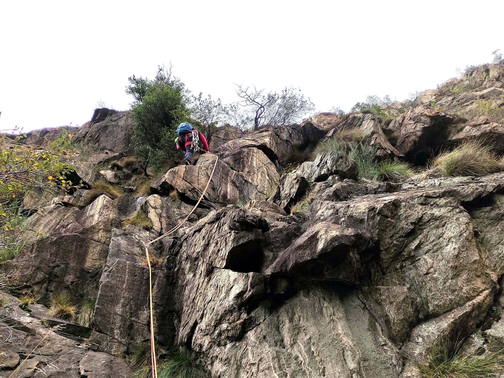 Noi a questo punto, non volendo fare troppo affidamento sulla clemenza del meteo, abbiamo deciso di non andare oltre: mancavano un 6a (già fatto anni addietro in Dr Jimmy e I love you Sylvie) e un altro facile tiro di corda fino alla vetta… ma raggiunta questa quota eravamo letteralmente all’interno di una coltre nuvolosa non proprio piacevole, soprattutto per le temperature😅!