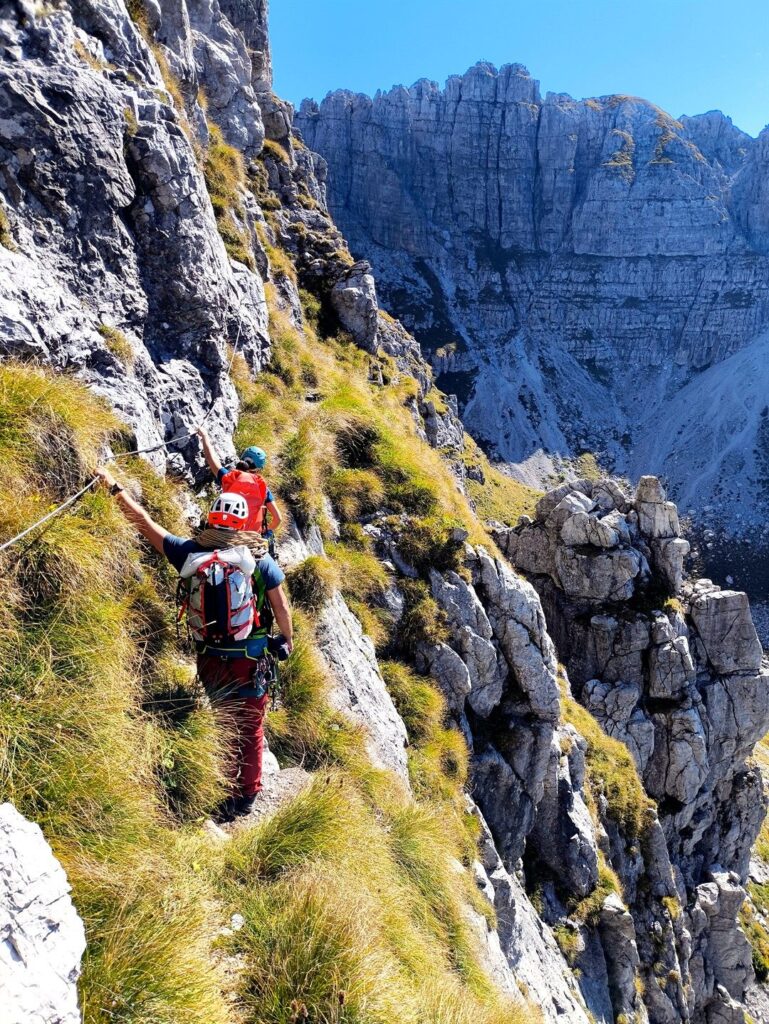 prendere la traccia di sentiero verso destra seguendo i bolli gialli e poi i cavi d’acciaio presenti in loco (nel nostro caso erano in ottime condizioni) che permettono di percorrere la cengia in sicurezza fino a scendere in un canalone, dove guardando a monte si vede un masso enorme imbrigliato nei cavi. Proseguire e superare questo canalone sempre seguendo la traccia segnata, si supera un avancorpo roccioso leggermente a monte e si prosegue in orizzontale attraverso un altro canalone di sfasci adiacente.