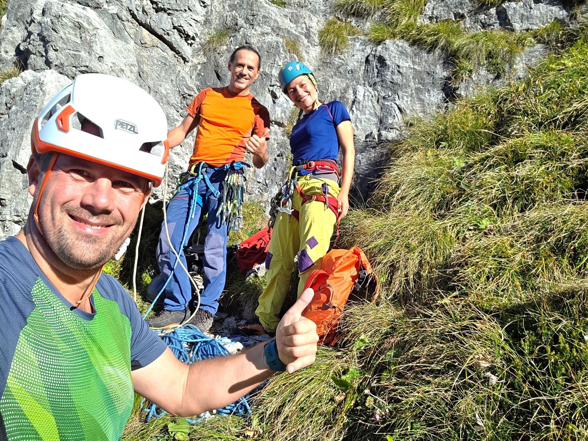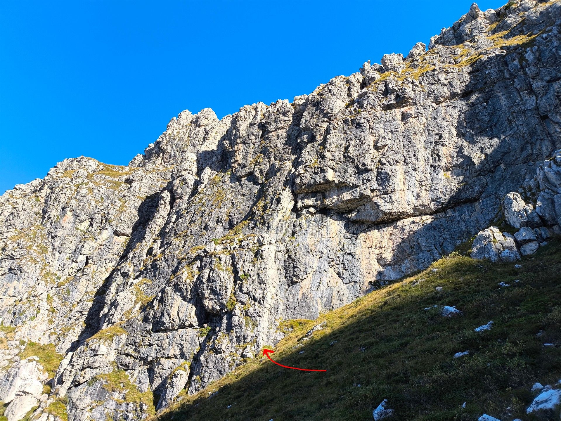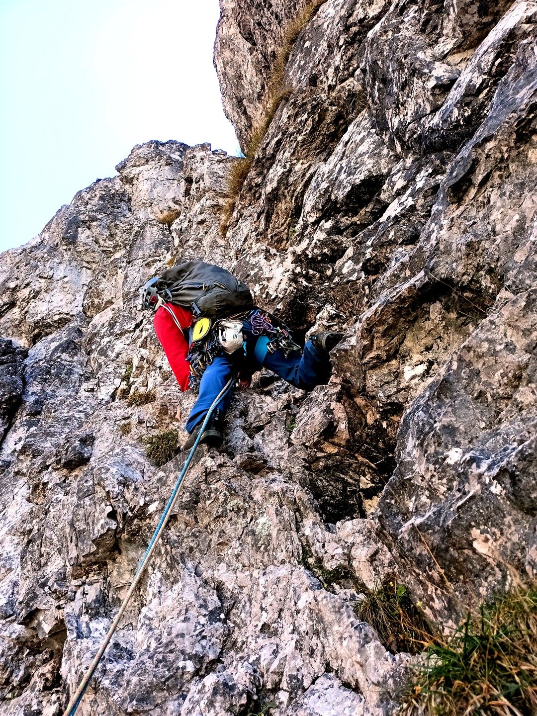 Alternativamente, ma non abbiamo verificato, è possibile salire sopra la sosta e andare invece verso destra, dove è visibile un fittone alla base di un muretto verticale. A parte questo fittone sul muretto non sembrano esserci altre protezioni. Oltre a questo, sembra scomodo e pericoloso anche solo raggiungere la cengia di destra, ma non ci abbiamo provato onestamente. Siamo andati a occhio e ha vinto la sinistra 😛