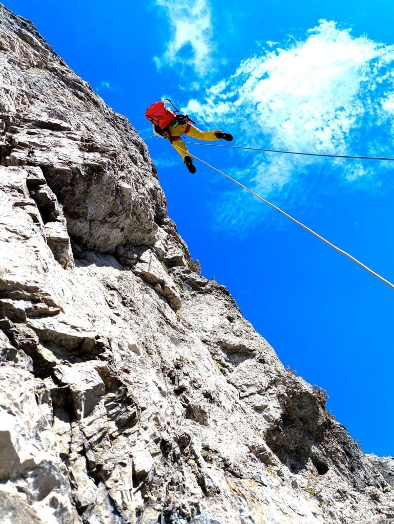 Dalla sosta su cui siamo arrivati ci siamo spostati su una sosta immediatamente a destra, nuova fiammante, con due anelli di calata alle estremità. Crediamo di esserci calati sulla Via Batuffi, che solo a vederla mette paura anche se noi l’abbiamo seguita in discesa 😀 , praticamente è quasi tutta strapiombante! Da qui comunque ce la si fa in un’unica calata nel vuoto da 55 m (ma meglio fare i nodi a fondo corda, non si sa mai) raggiungendo la cengia erbosa sottostante e la traccia di sentiero che la percorre.