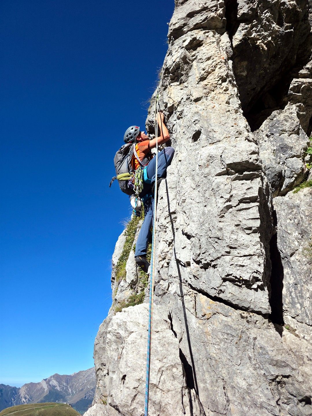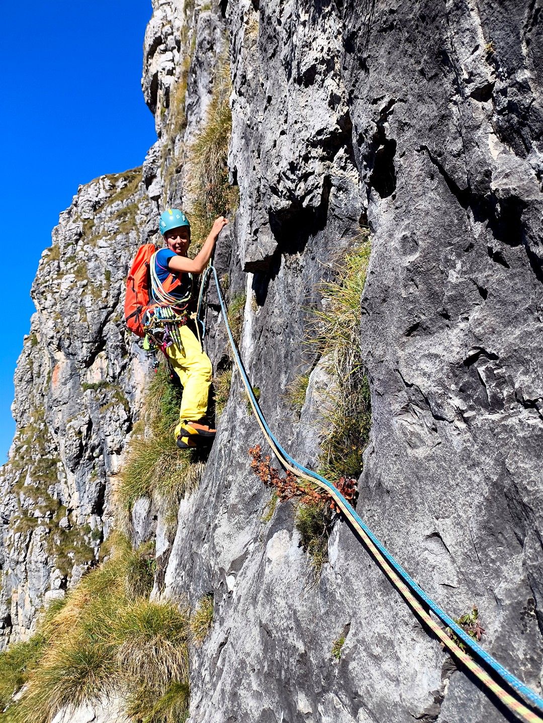 - III (15 m): si traversa verso destra con passi facili ma esposti, fino alla sosta. Consigliabile rimanere all’esterno sulle rocce più basse (ma esposte) ed evitare di salire il gradino che porterebbe a trovarsi invece sotto roccia aggettante.
