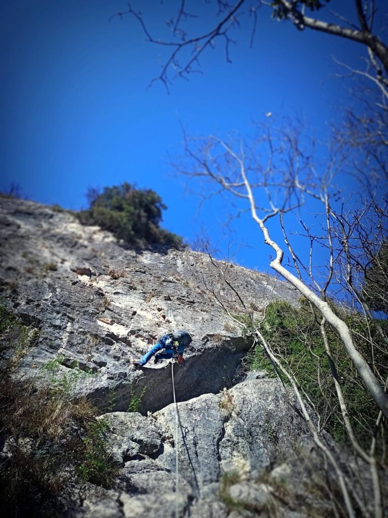 - L1 – IV+ (30 m) – si sale un avancorpo verso sinistra, si supera un muretto verticale con abbondanza di appigli e appoggi , poi in leggera diagonale sinistra più appoggiato, infine dritto: sosta da attrezzare su albero isolato che resta sulla destra;