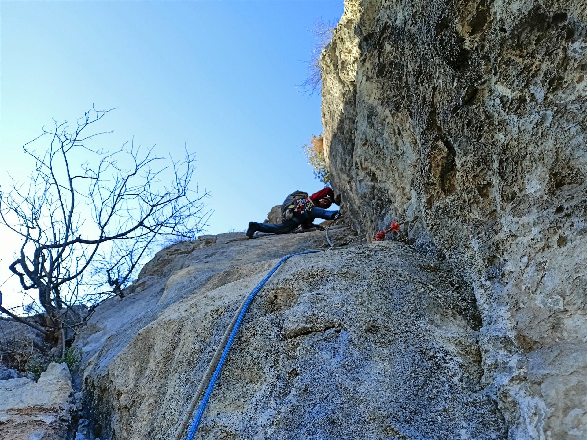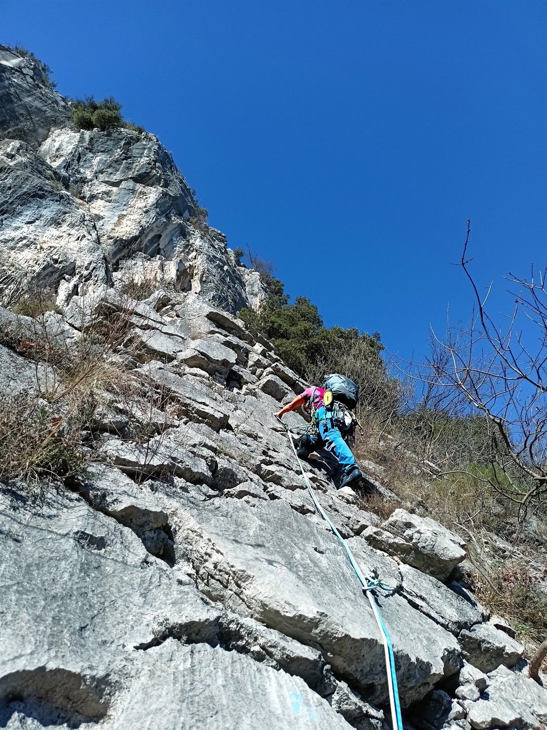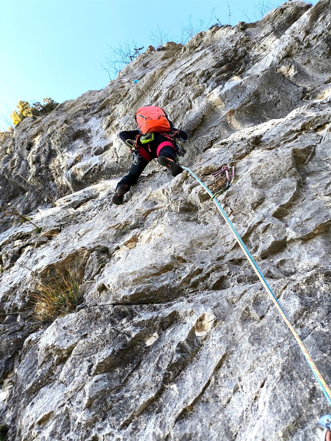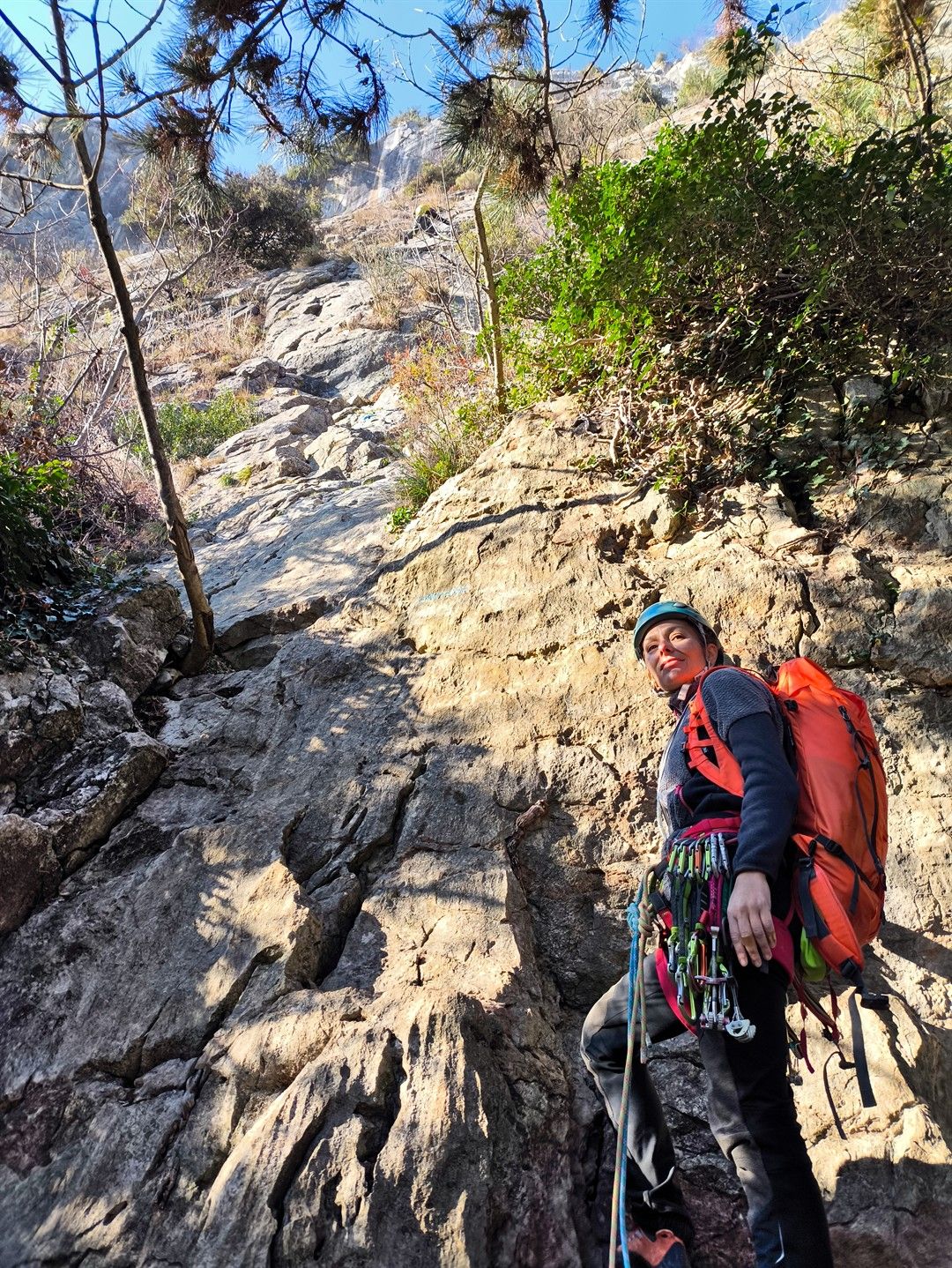 - L4 – IV+ (20 m) – salire a sinistra della sosta per poi obliquare subito a destra su placca questa volta compatta, a risalti, fino ad uscire su ampio terrazzo con alberello ove si sosta;