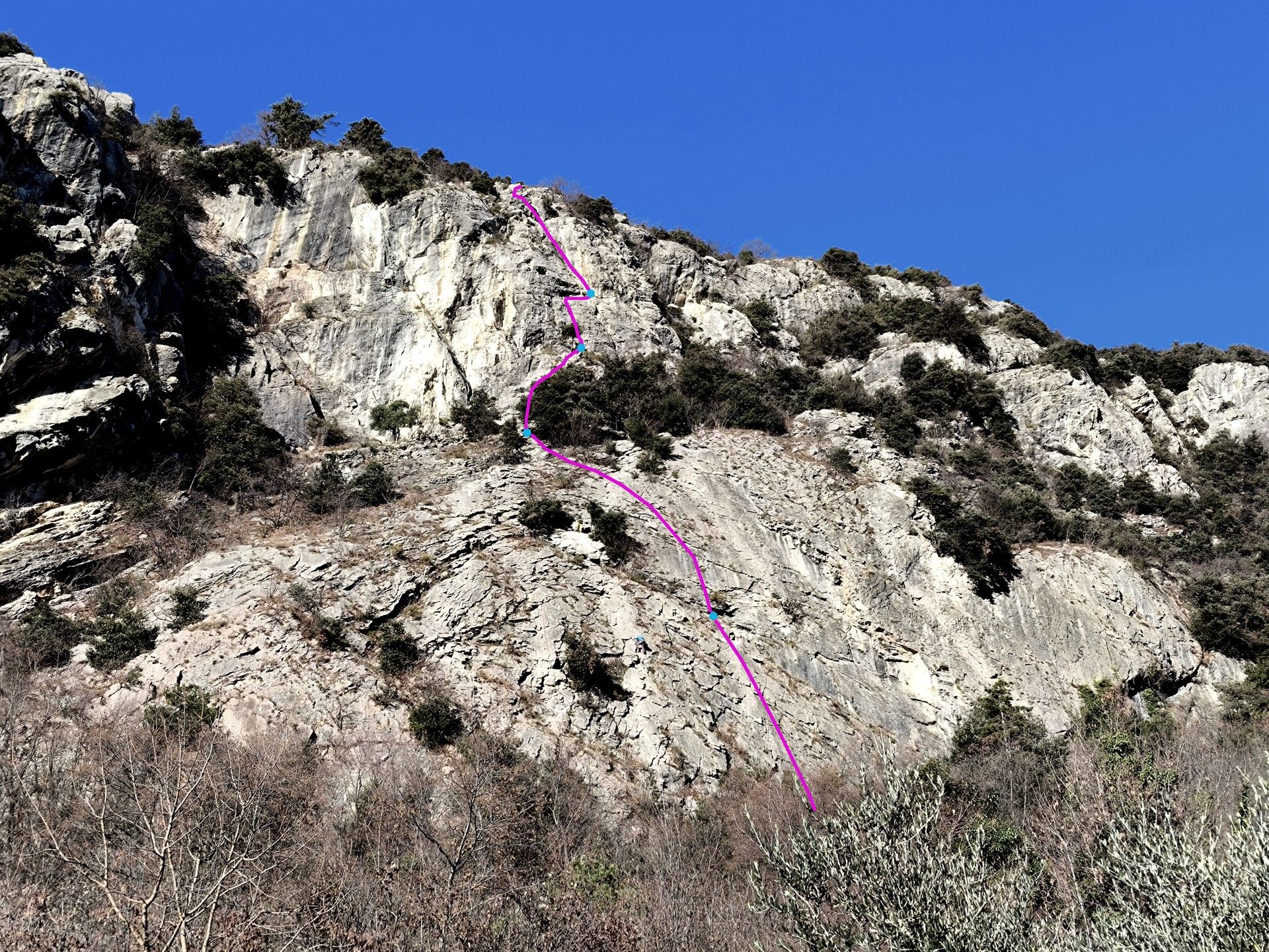 E’ bizzarro, ma nella zona di Arco non avevamo mai esplorato le pareti del Monte Baone: è stata una bella scoperta trovare roccia più che buona in un ambiente davvero gradevole, con bellissimi uliveti che si estendono fin quasi sotto le pareti e che si attraversano per arrivare all’attacco.
