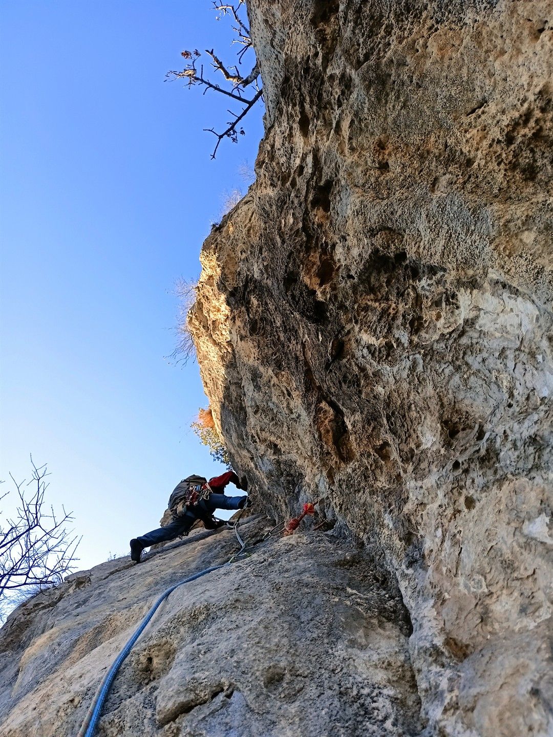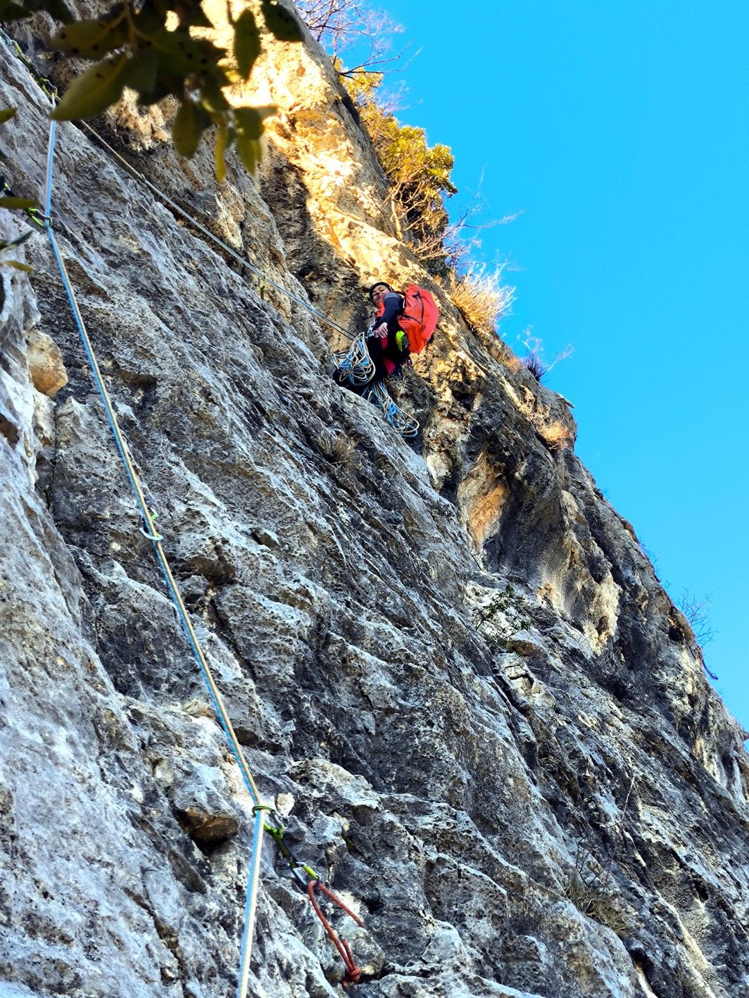 Abbiamo anche provato ad osare qualcosa di più con la Via Plasmata, l’ultima della parete… sarà che non era giornata ma il primo tiro (quello della foto qui sopra) ci è sembrato piuttosto cattivello, tale da farci desistere al suo termine e optare per qualcosa di più godereccio e senza pensieri 🙂 Questo assaggio però è stato interessante quindi l’intenzione è di tornare quando ci sarà maggiore volontà di sbattersi 😛