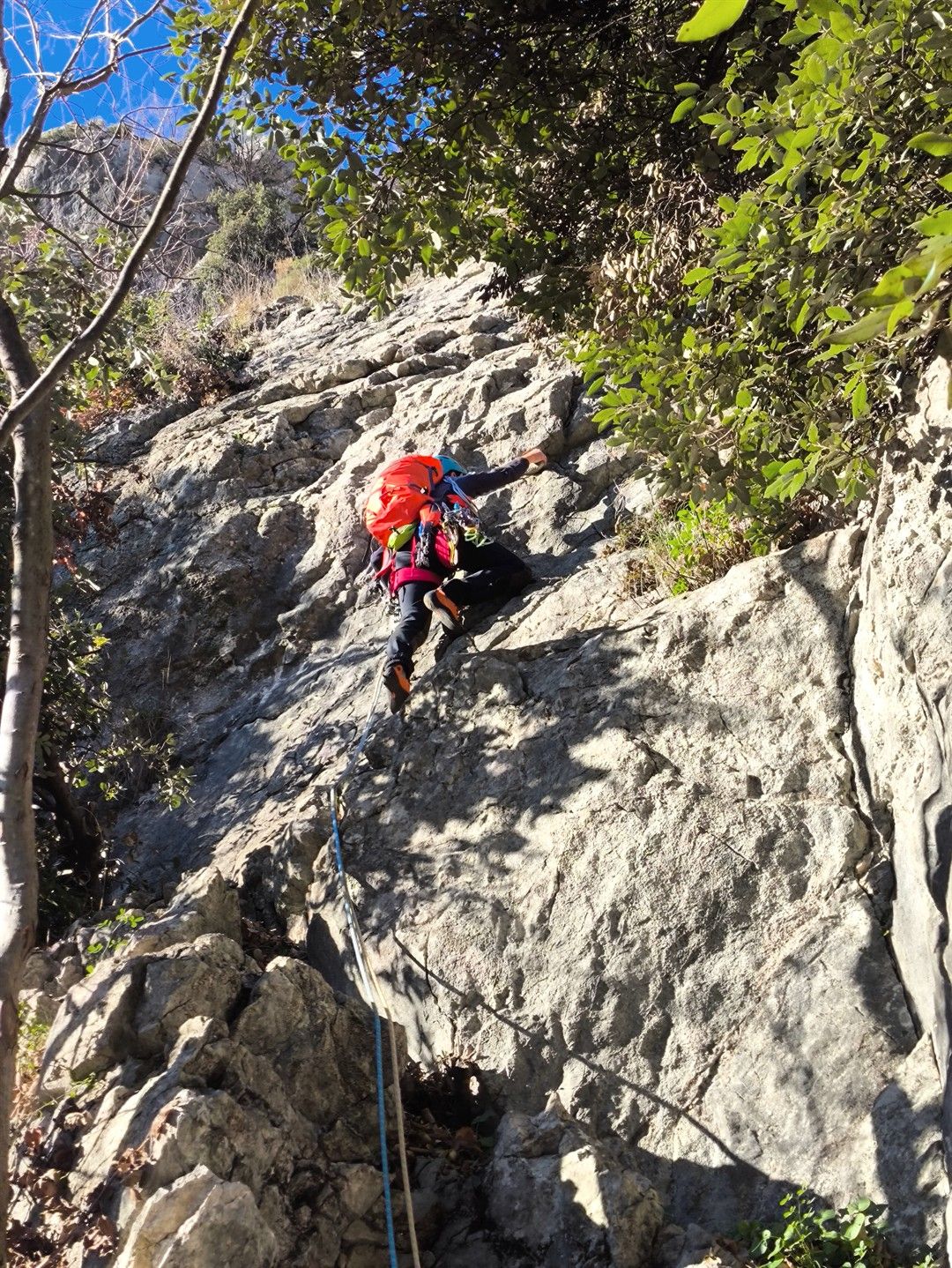 - L1 – IV+ (30 m) – si sale un avancorpo verso sinistra, si supera un muretto verticale con abbondanza di appigli e appoggi , poi in leggera diagonale sinistra più appoggiato, infine dritto: sosta da attrezzare su albero isolato che resta sulla destra;