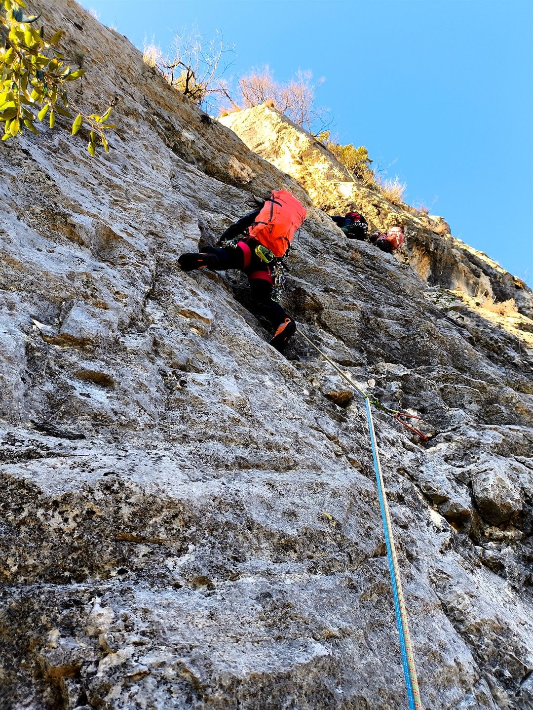 - L5 – VI oppure V+ A0 (35 m) – salire a destra della sosta con passo delicato, poi affrontare una bella sezione verticale/strapiombante con buone mani ma faticosa e continua (abbondanti protezioni) verso destra, fino ad uscire su parete più appoggiata e via via più facile fino alla sosta finale.