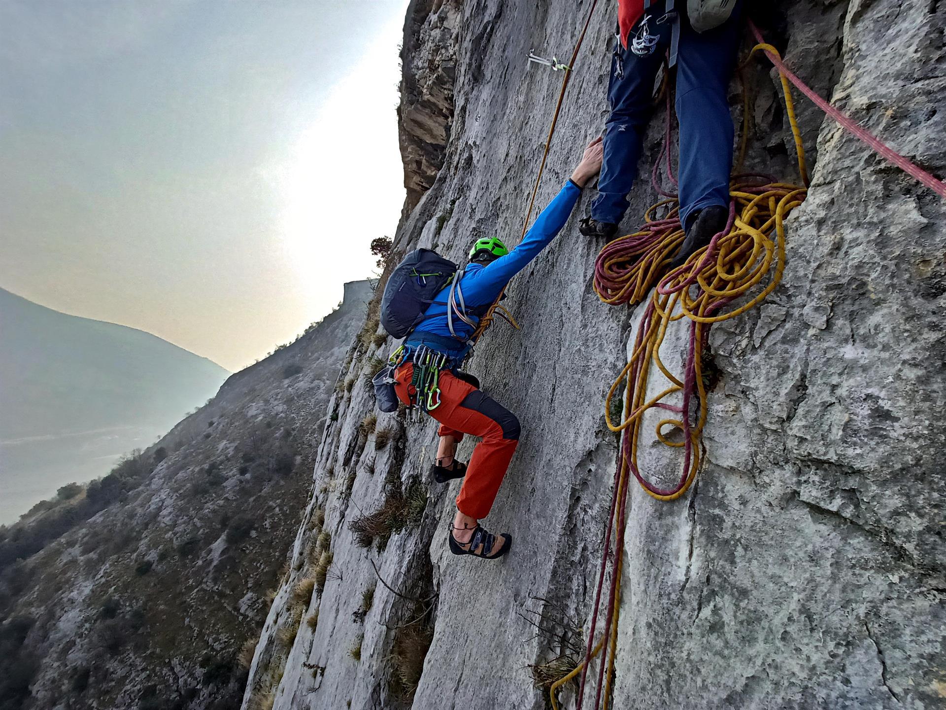 Le protezioni sono a tratti molto vicine e a tratti più distanti (talvolta 4-5 metri), motivo per il quale ha senso portarsi dietro qualche friend medio/piccolo e qualche cordino per integrare (i cordini servono anche per le soste che sono a fix, ma da collegare).