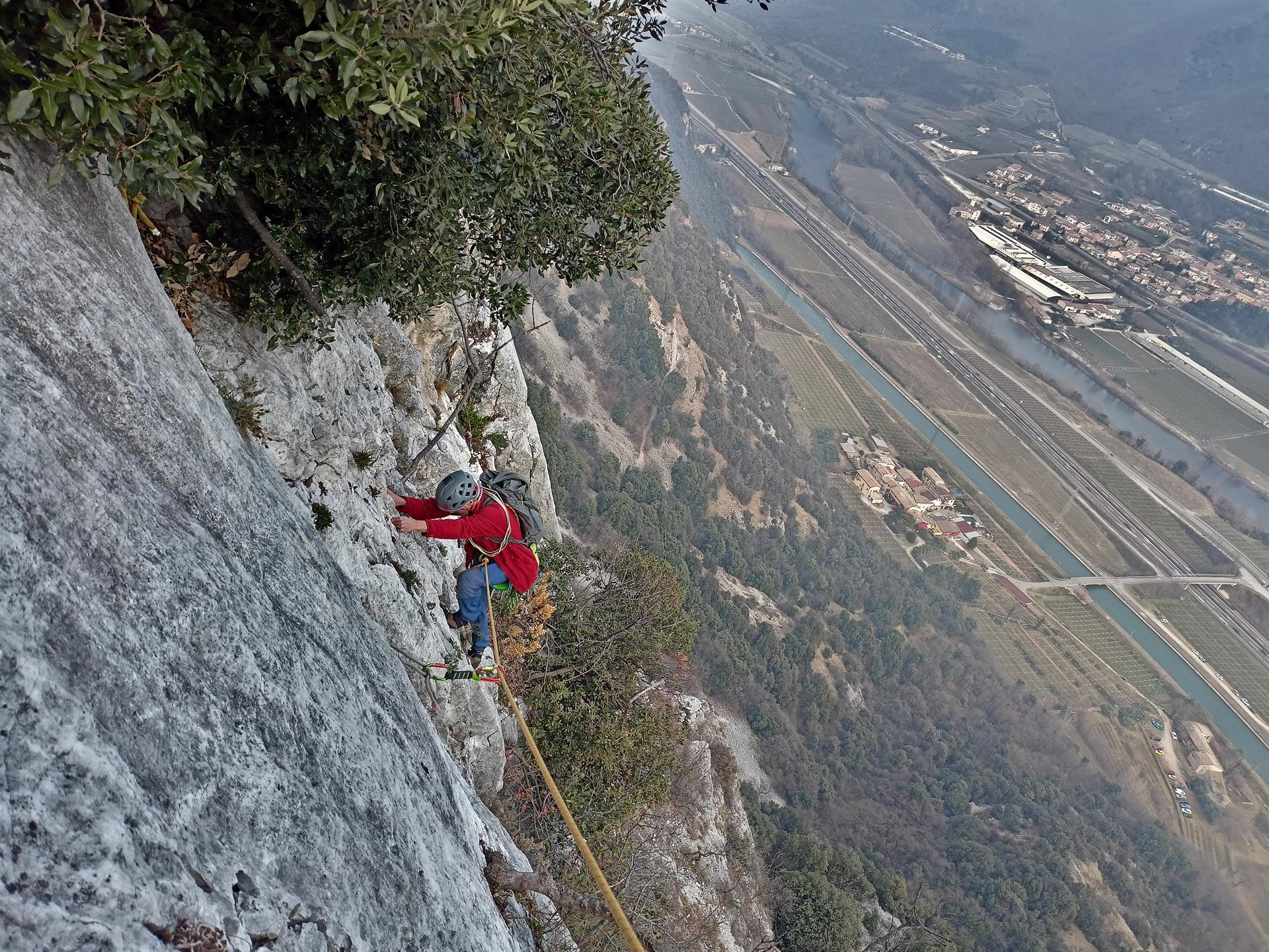 Arieccoci a Tessari: dopo Poison Ivy + Bella Gioia prendiamo coraggio e alziamo un po’ il grado 😉 perchè abbiamo capito che da queste parti anche sulle vie “miste” o vagamente trad come questa, le protezioni non mancano.