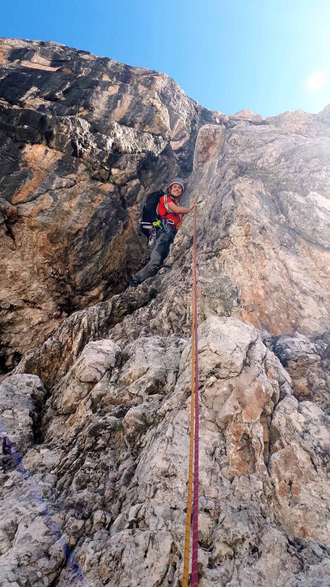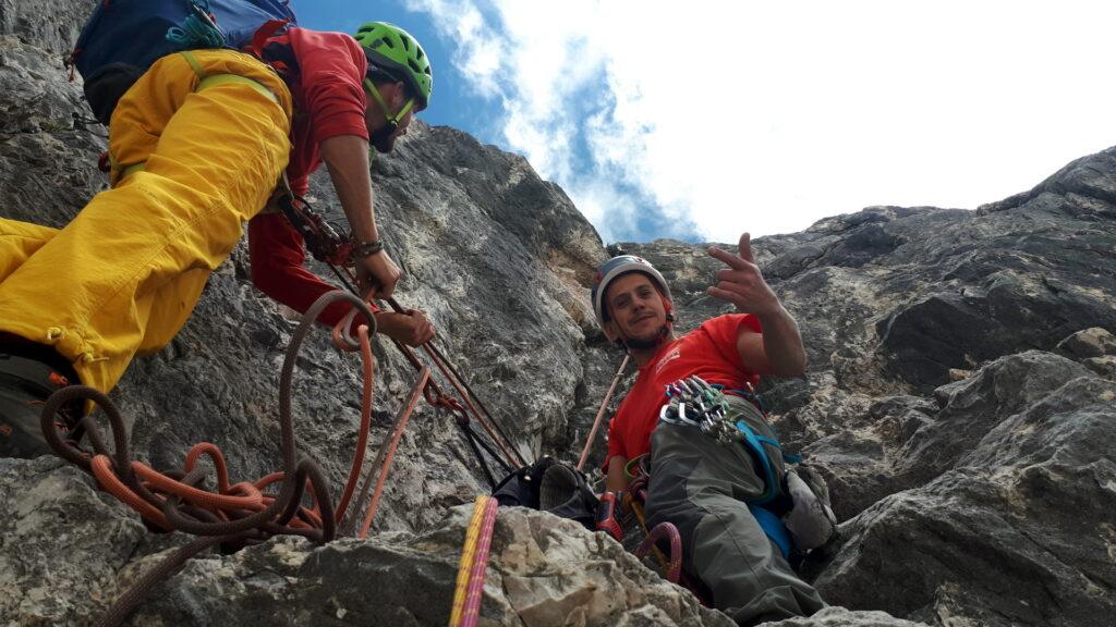 Sta di fatto che dopo i primi 7 tiri abbiamo optato per uscire verso la via normale perché eravamo molto stanchi e anche un po’ provati dalla lettura della via che si è rivelata più complessa del previsto.