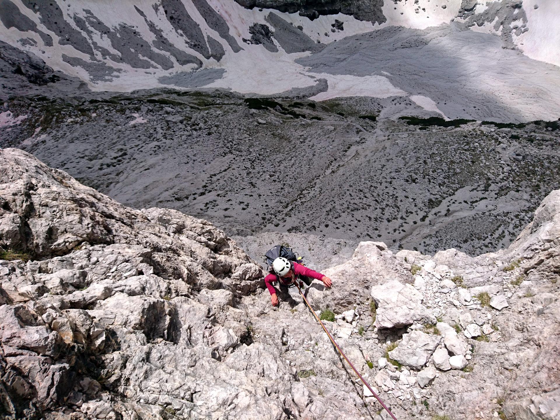 Come spiegato nell’introduzione, i primi 3 tiri che abbiamo fatto sono relativi alla via originale aperta da Kiene e non alla via che viene percorsa attualmente dalla maggior parte delle cordate (grande camino).