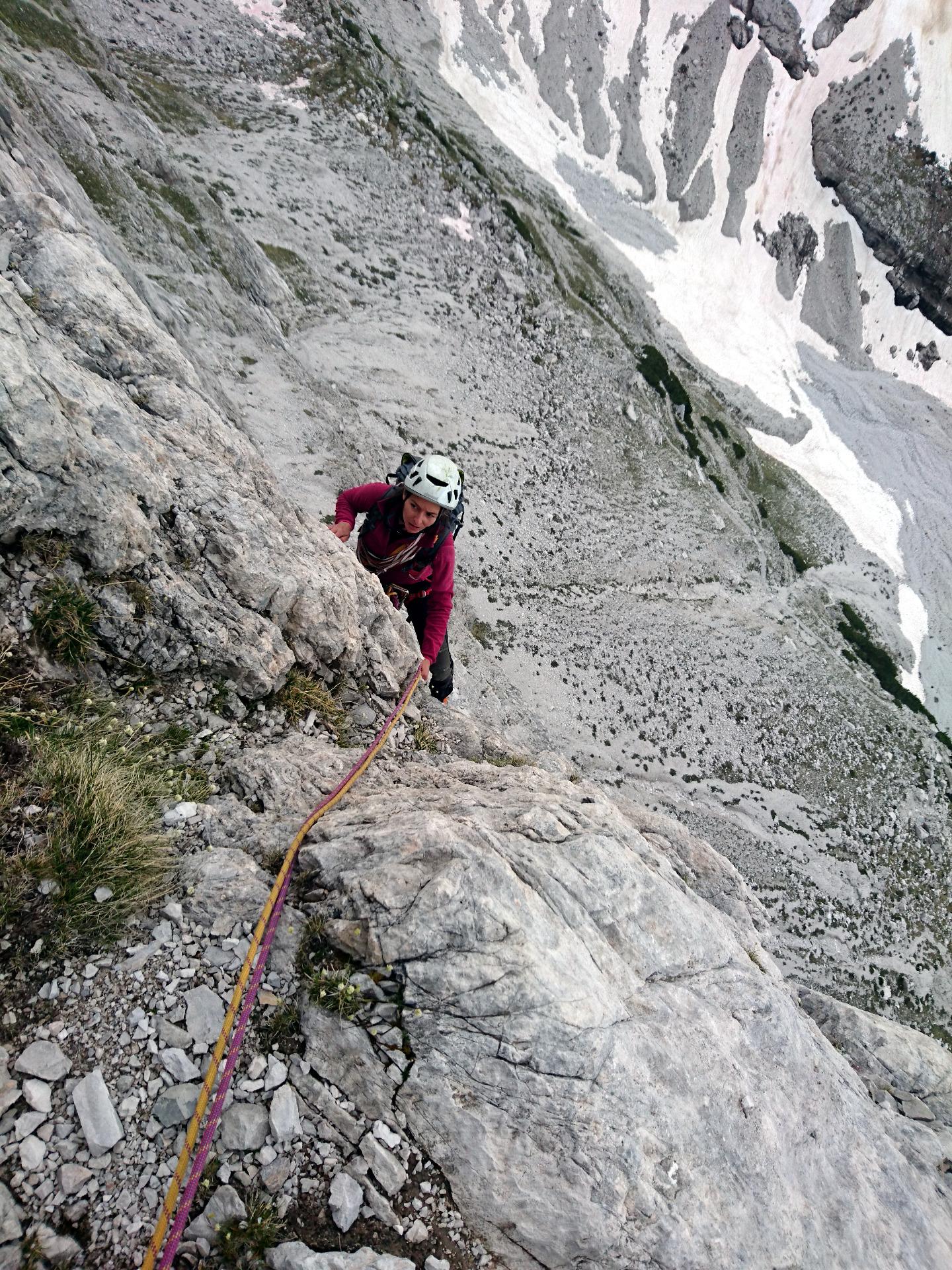 Il problema è che quella parete è salibile più o meno ovunque e qua o là si trova sempre qualche vecchio chiodo, solo che il nostro percorso non corrispondeva con quello delle relazioni che avevamo e quindi boh….non siamo in grado di dire se abbiamo salito effettivamente la via Kiene o se abbiamo scelto delle varianti tutte nostre.