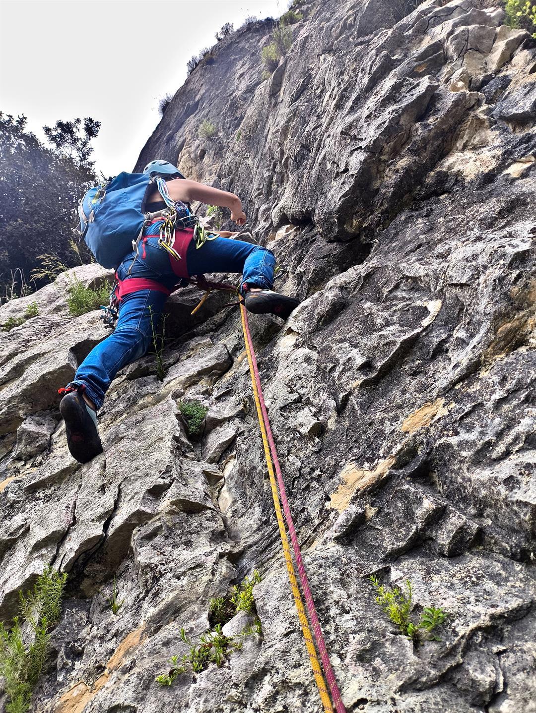 Quindi in verticale sulla placca del secondo diedro (a mio avviso il primo movimento è 6a+) che nella seconda parte si risolve stando a destra e sfruttando le buone mani nel diedro (6a). Infine in sosta, un po’ appesi ma soddisfatti 😉 - L6 – 5c (40m) – Primo passo un po’ delicato in placca fino al primo spit (5c), poi spostarsi leggermente a sinistra e seguire il lavorato spigolo (4b/c) protetto un po’ più lungo (volendo è possibile integrare) fino ad uscire sul terrazzo sovrastante dove entro breve si sosta.
