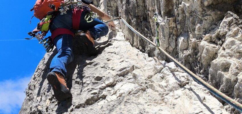 6. L6 – II+ (15m) – Traversare ancora a destra su cengia esposta fino a raggiungere la sosta sotto uno strapiombino.